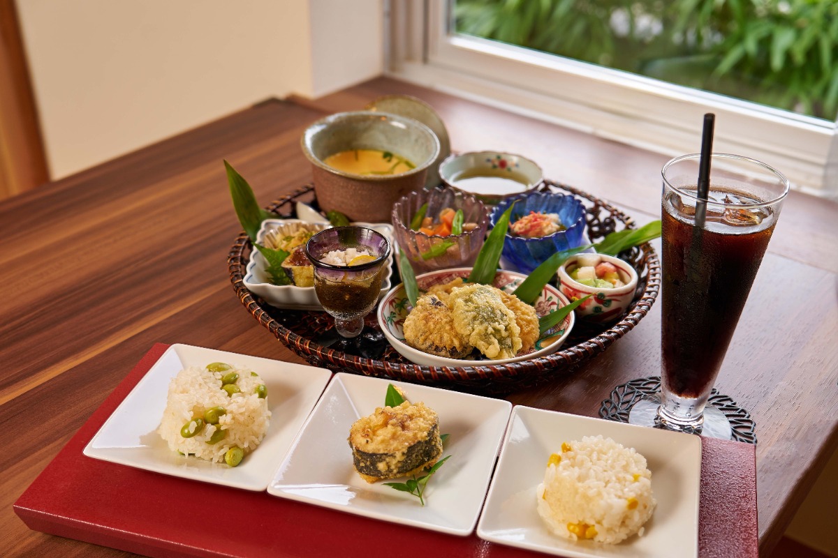 10の皿や小鉢に、天ぷらや季節の食材を用いたおかずがずらりと並び、様々な種類を少しずつ味わえます。