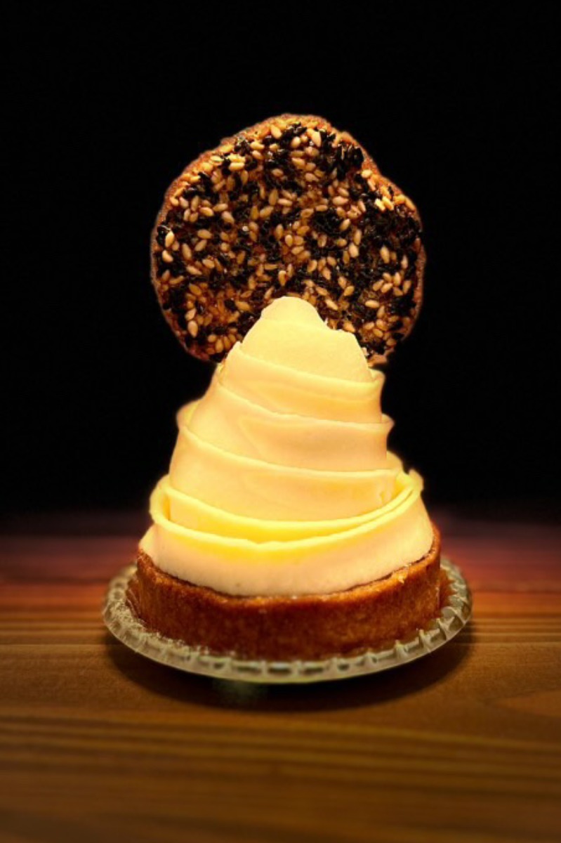 上にのせた「ごまのチュイール」のゴマの香ばしさと優しい味わいのなると金時芋が相性抜群です!