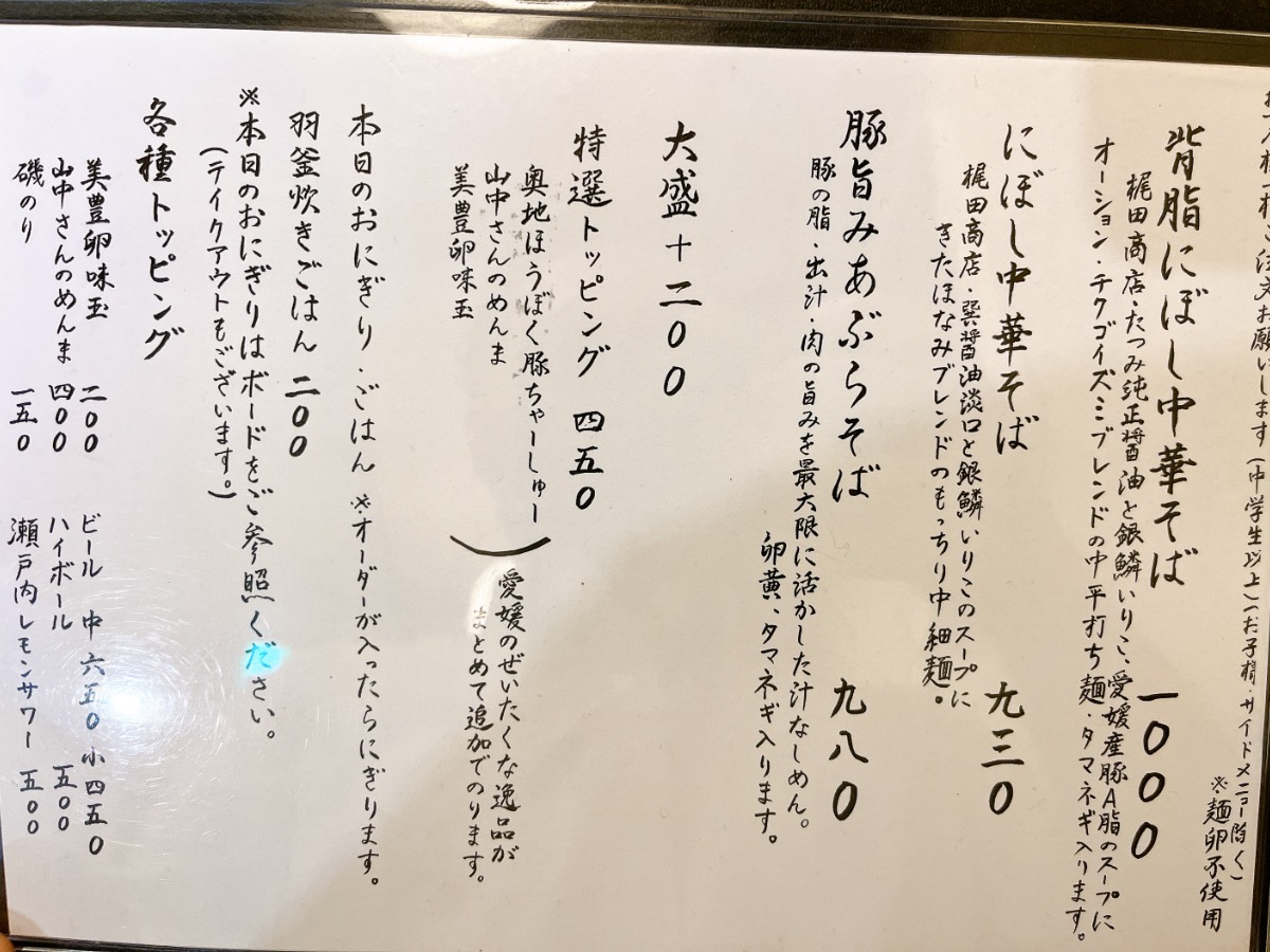 メニューは、にぼしスープの「中華そば」を中心に提供していて、愛媛の地元食材をふんだんに使うのが特徴です。