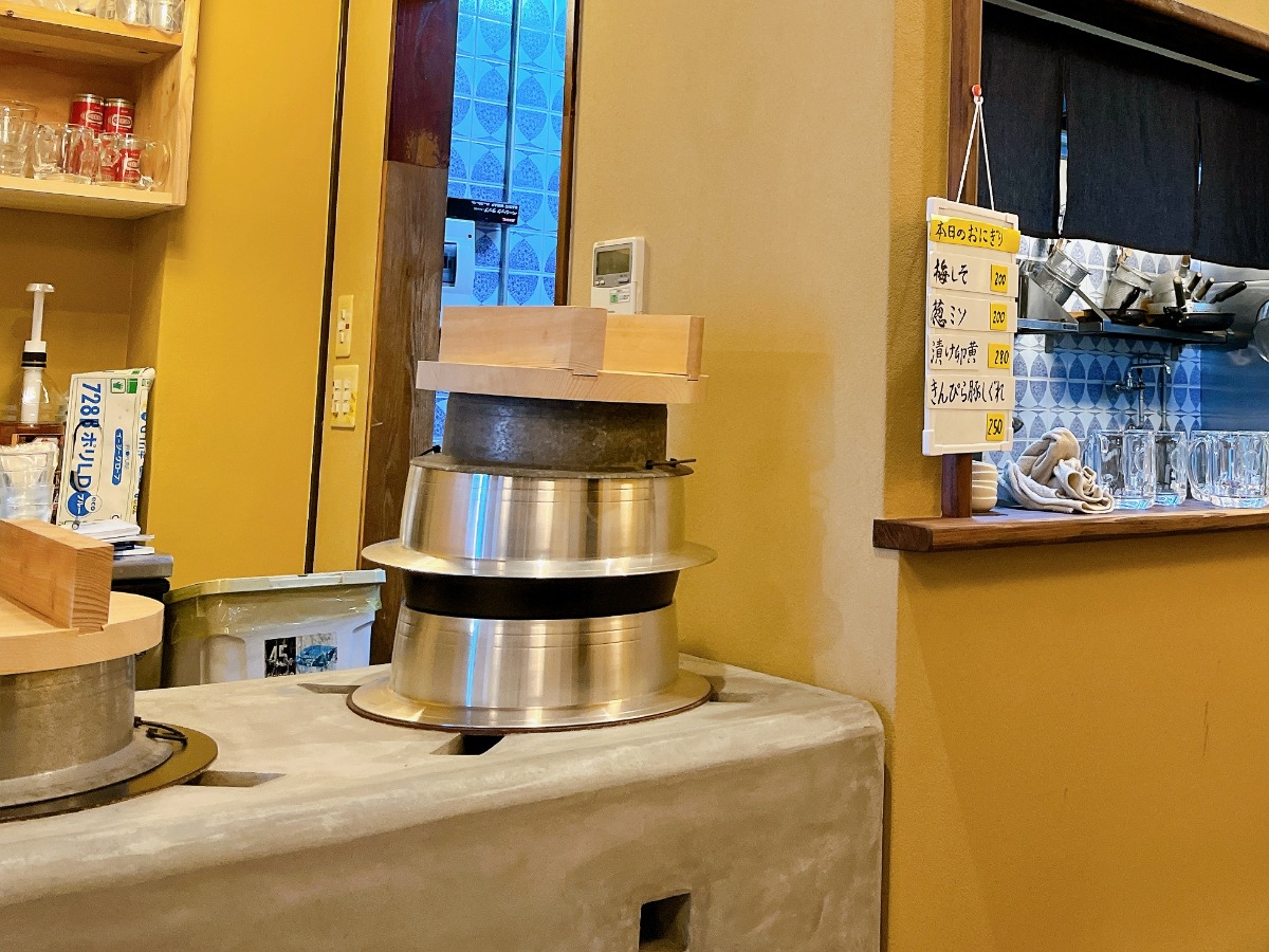 「釜炊きご飯のおにぎり」は、店内にある大きなかまどを使って、愛媛のブランド米「ひめの凛」を炊いています。この地域の地下水を使用して炊き上げたお米を使っており、その甘みとふっくら感が際立っています。