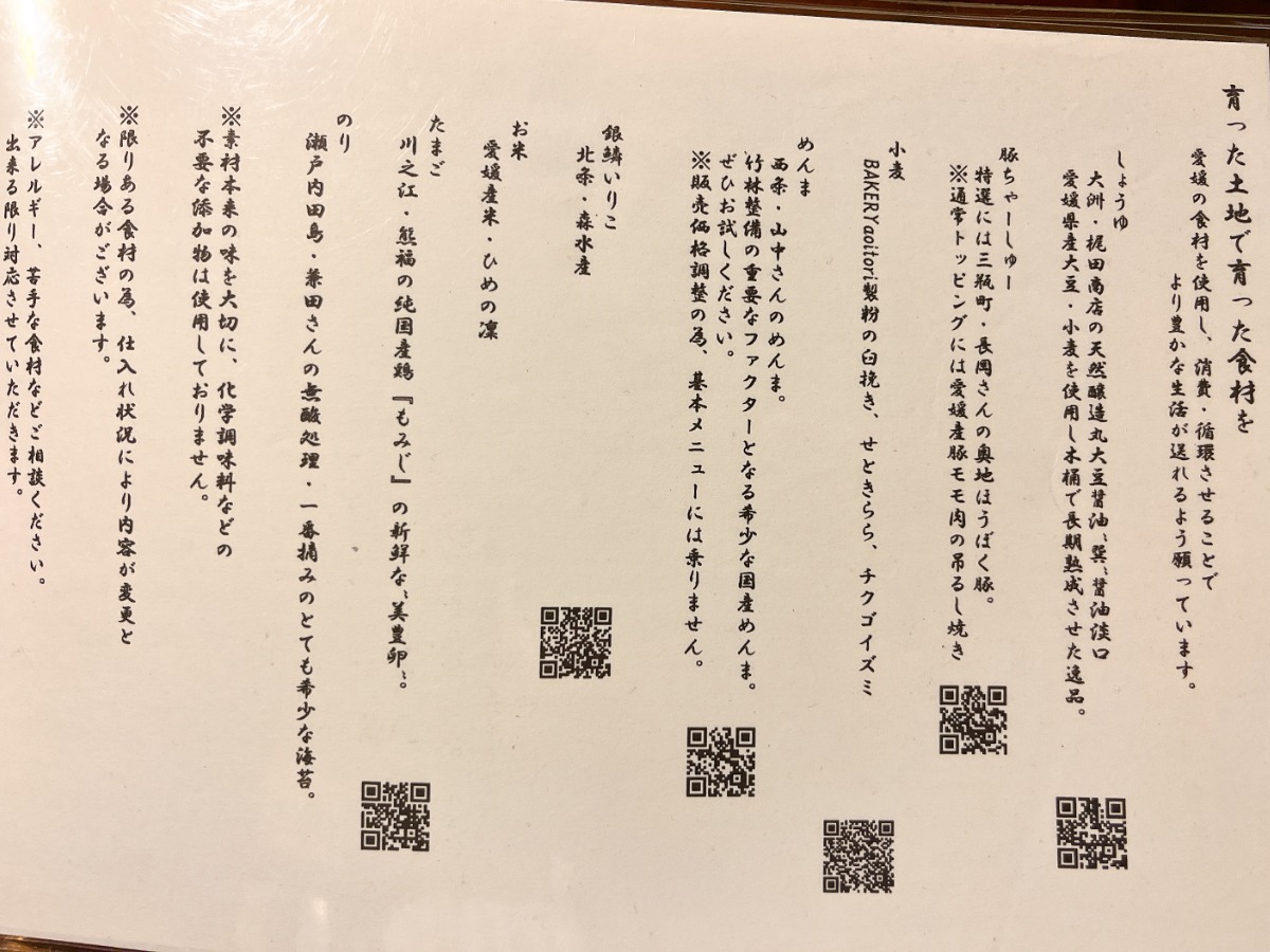 化学調味料を一切使わず、素材そのものの味わいを最大限引き出していて、例えば、愛媛の海で獲れたいりこや海苔、地元の畑で育った有機野菜、老舗醸造所のしょうゆなど、オーナーと店長が自らの目と舌で確認した食材のみを使用しています。それらはメニュー表にも記載されているので、安心して食事を楽しめるのも大きな魅力です。