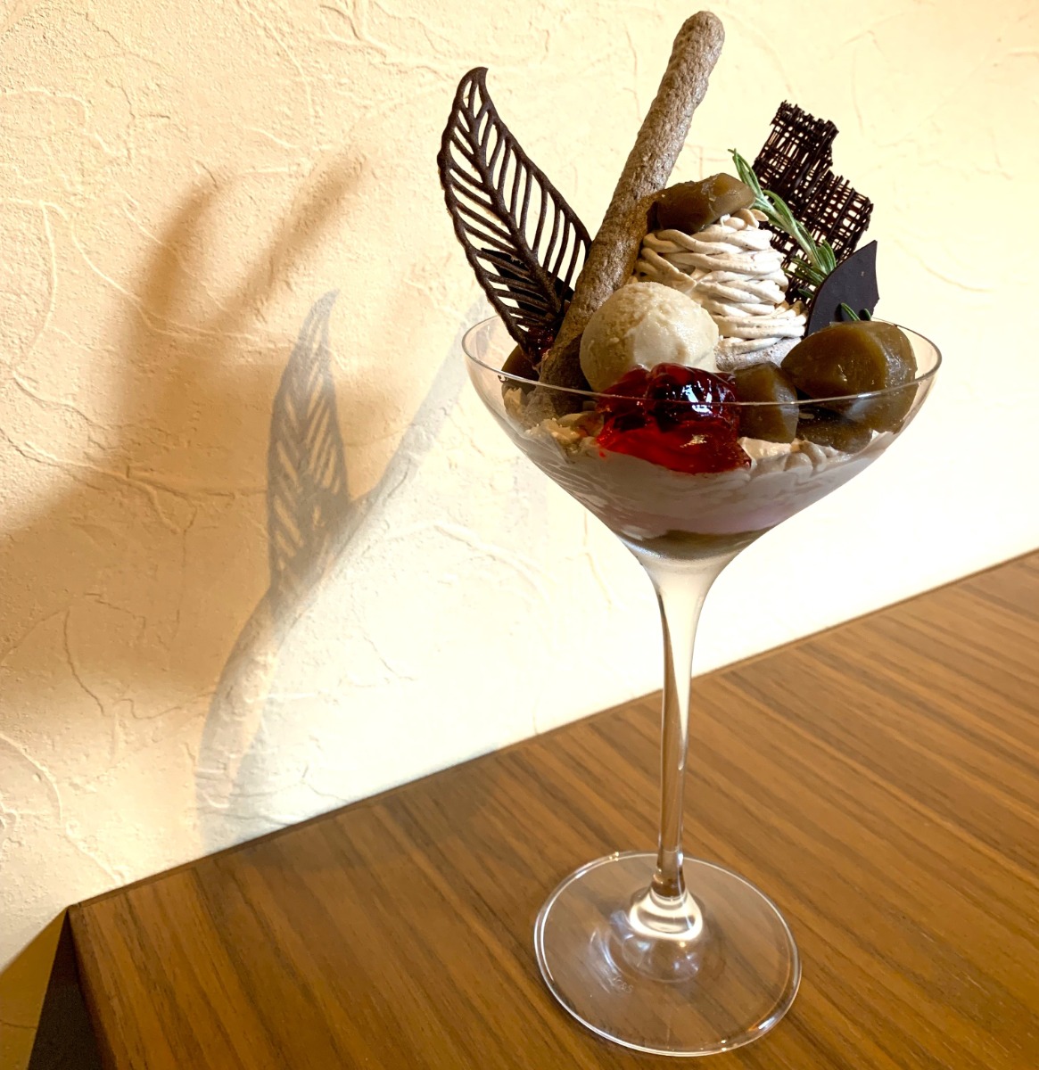 季節ごとのフルーツを堪能できる“夜パフェ”。10月からは和栗を提供し、チョコパフェは通年味わうことができます。