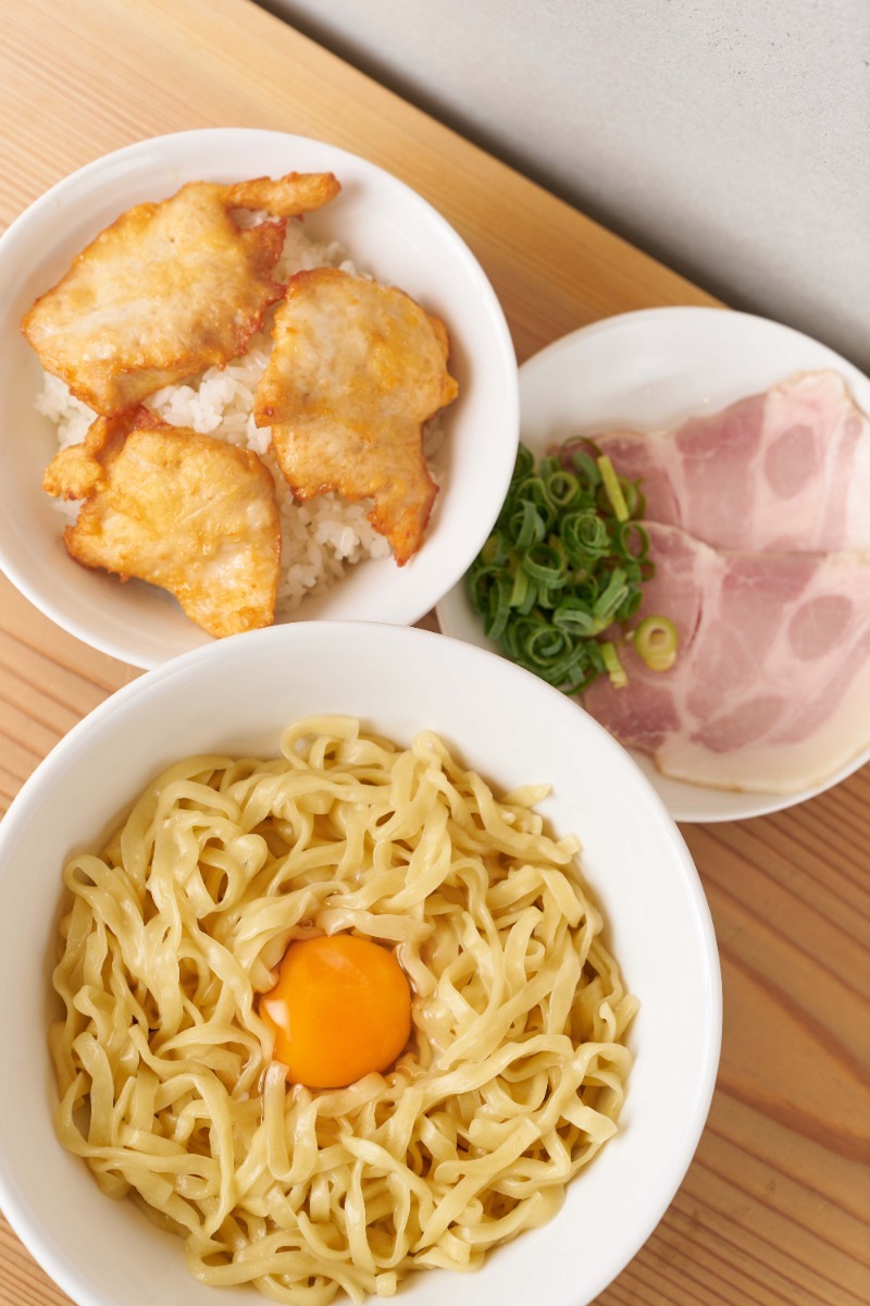 写真は、黄身が濃厚な「いけだ卵」をのせた熱いまぜそば「釜玉麺」。