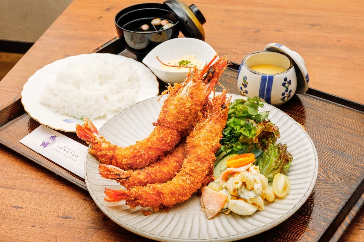 ランチの一押しは、頭から丸ごと揚げた20cm級のエビフライ3本、茶碗蒸し、お吸い物、ご飯、サラダが付いたボリューム満点セットです。