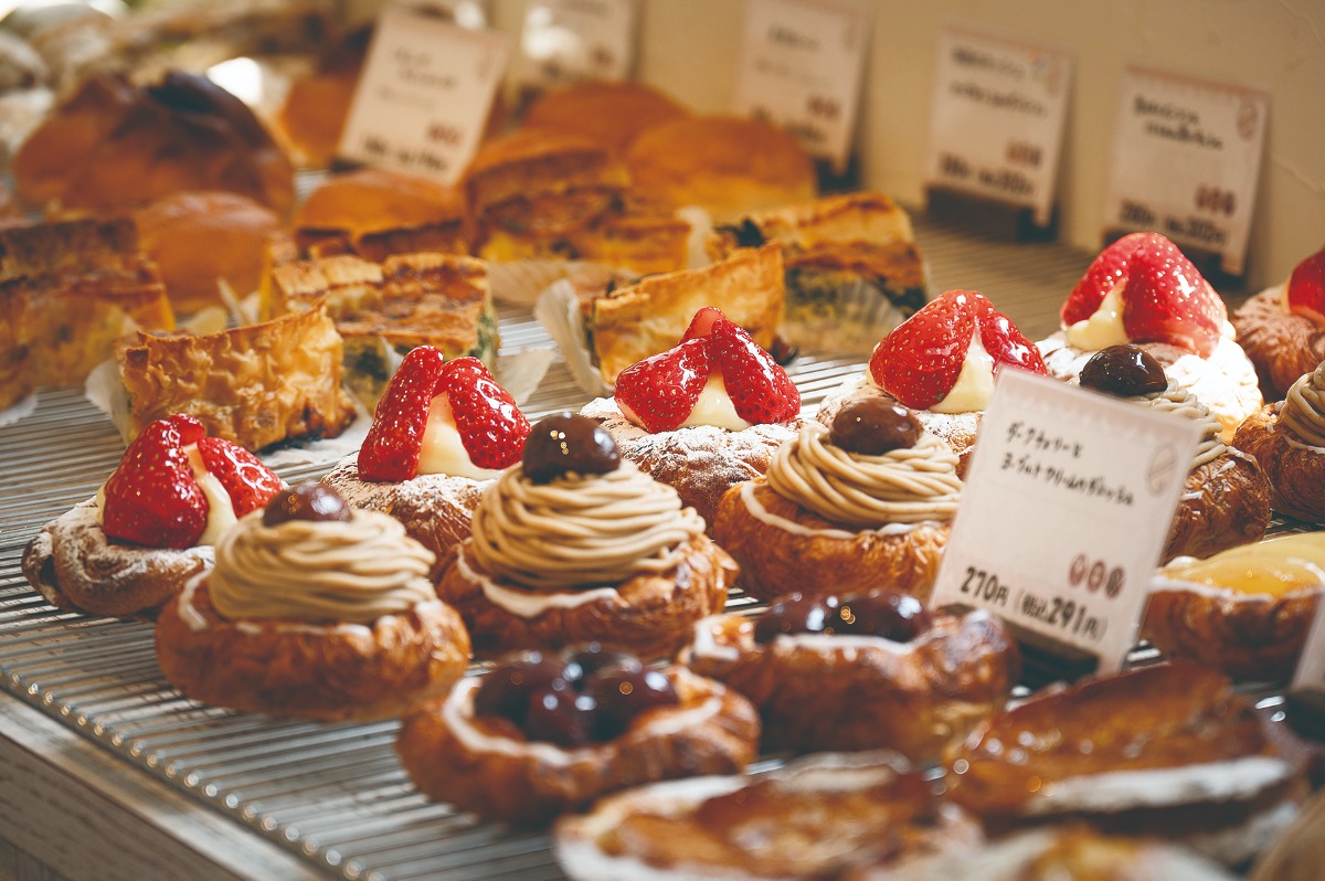 旬の野菜を使った惣菜パンや美しいスイーツパンなど約100種類ものパンが並びます。