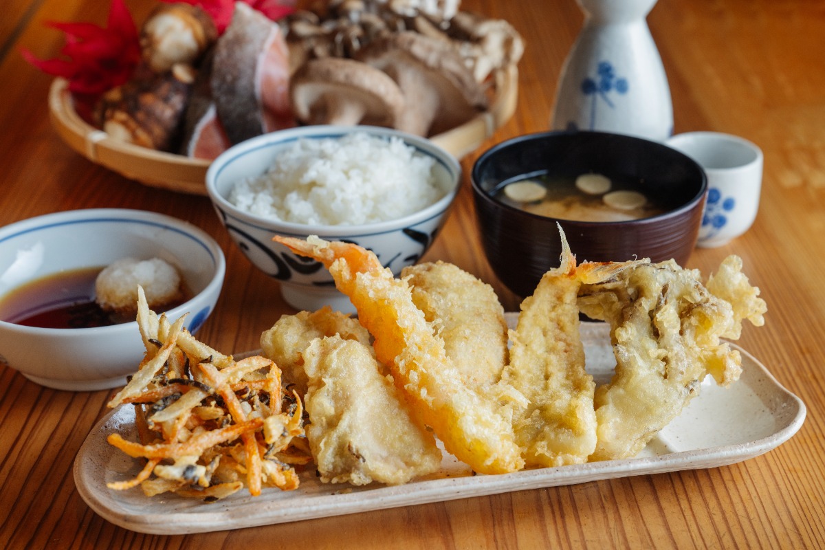秋の美味をたっぷり味わえる、海老・秋鮭・イトヨリダイ・椎茸の豚巻き・舞茸・とろっと里芋・ごぼうと塩昆布のかき揚げの計7品が楽しめる定食が1番のおすすめです!