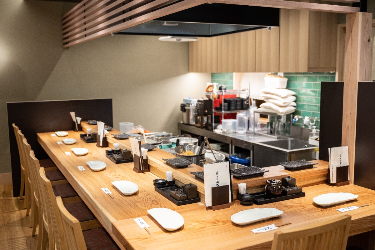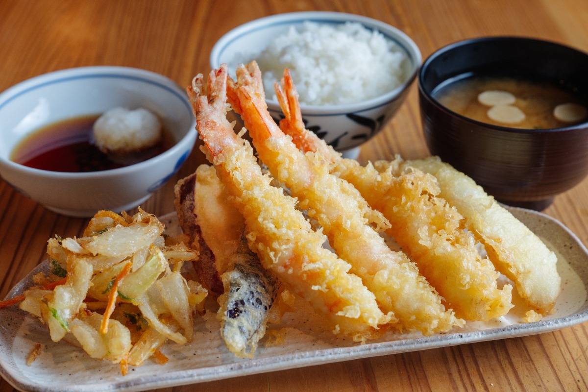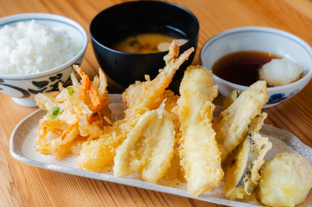 職人が目の前で揚げる、絶品の天ぷら定食を楽しめる