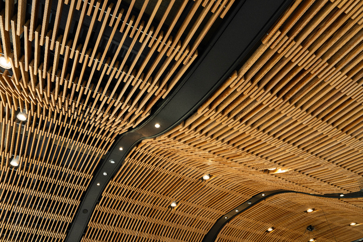 駅構内の天井に施された県内産のスギ やヒノキを使用したデザインが印象的