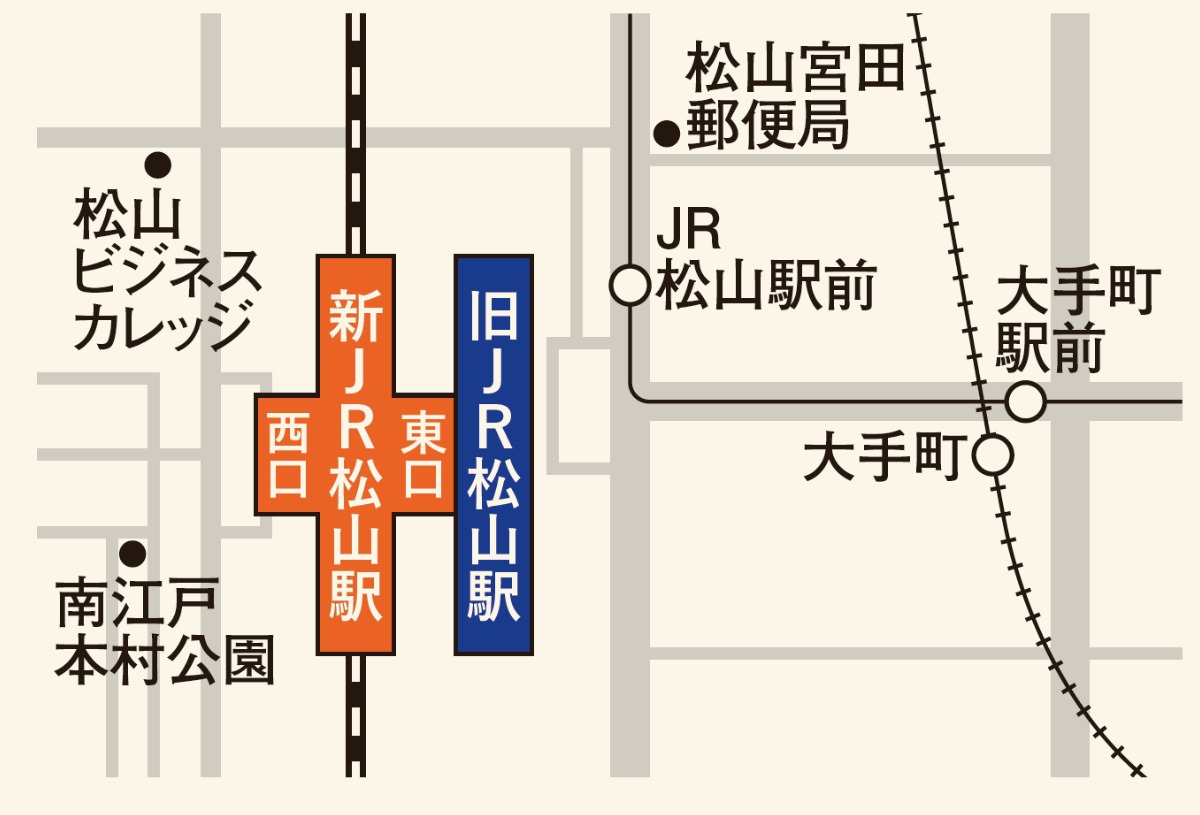 JR松山駅「改札」出てすぐ、伊予鉄道「JR松山駅前」下車徒歩約4分です。旧 JR松山駅内を通って、新JR松山駅に行くことができます。