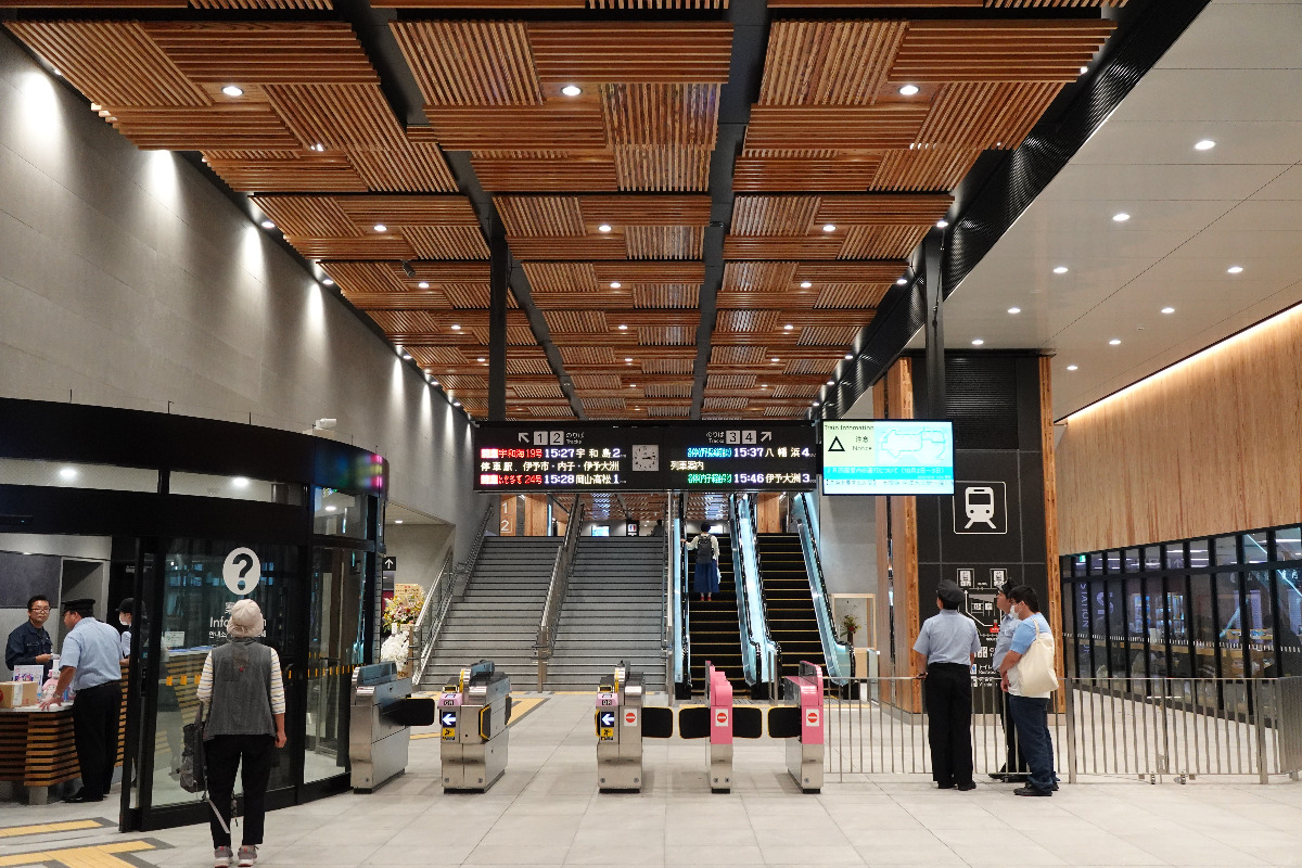 駅舎を西側に移転し、エレベーターやトイレ、授乳室などのバリアフリー設備が充実しました。また、特急列車「しおかぜ・いしづち」と特急列車「宇和海」が同じホームで乗り換え可能となるなど、利便性も良くなりました。