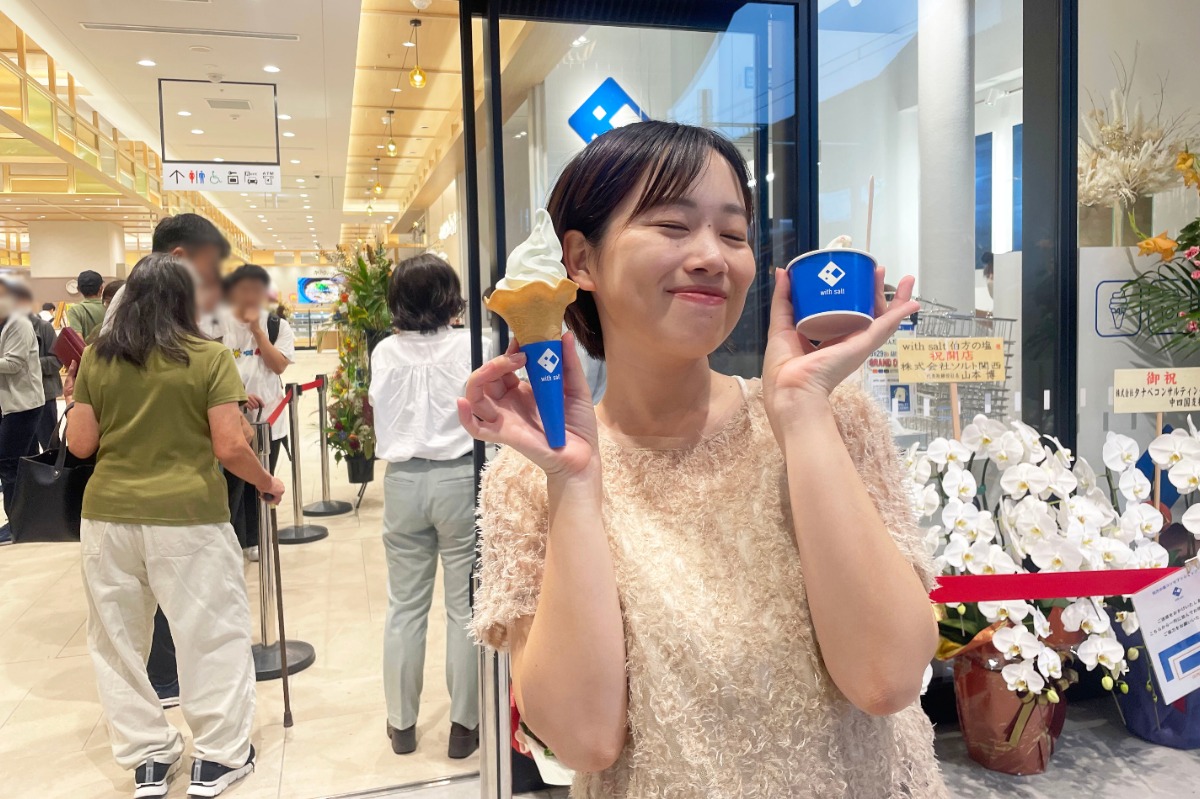 今まで大三島工場でしか食べることのできなかった「伯方の塩ソフトクリーム」をはじめ、県内の人気店とのコラボ商品を販売しています。ソフトクリームのトッピングは「ブラッドオレンジ」か「フルール・ド・セル」の2種類の塩から選べますよ。