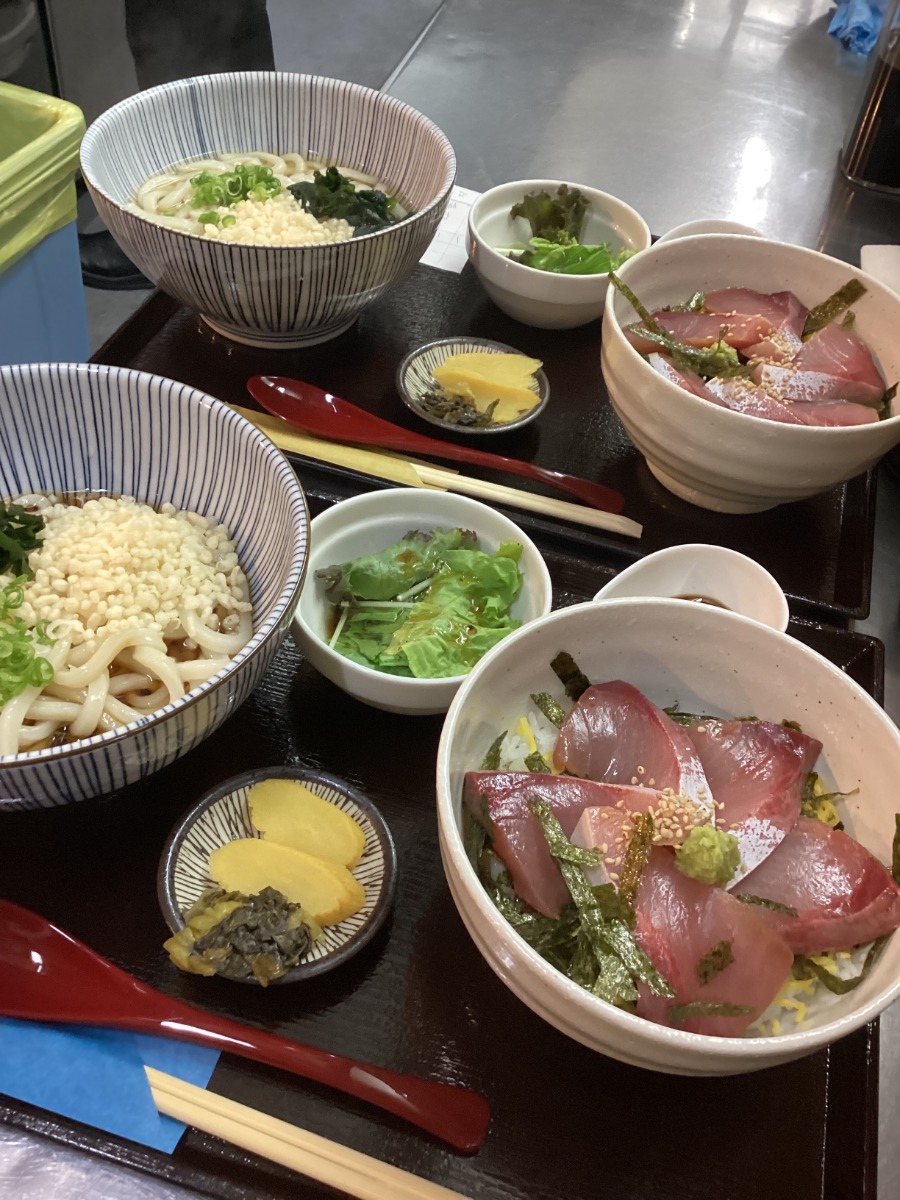昼のメニューはうどんと魚もしくは肉を使った丼がセットになった「本日のランチ」。