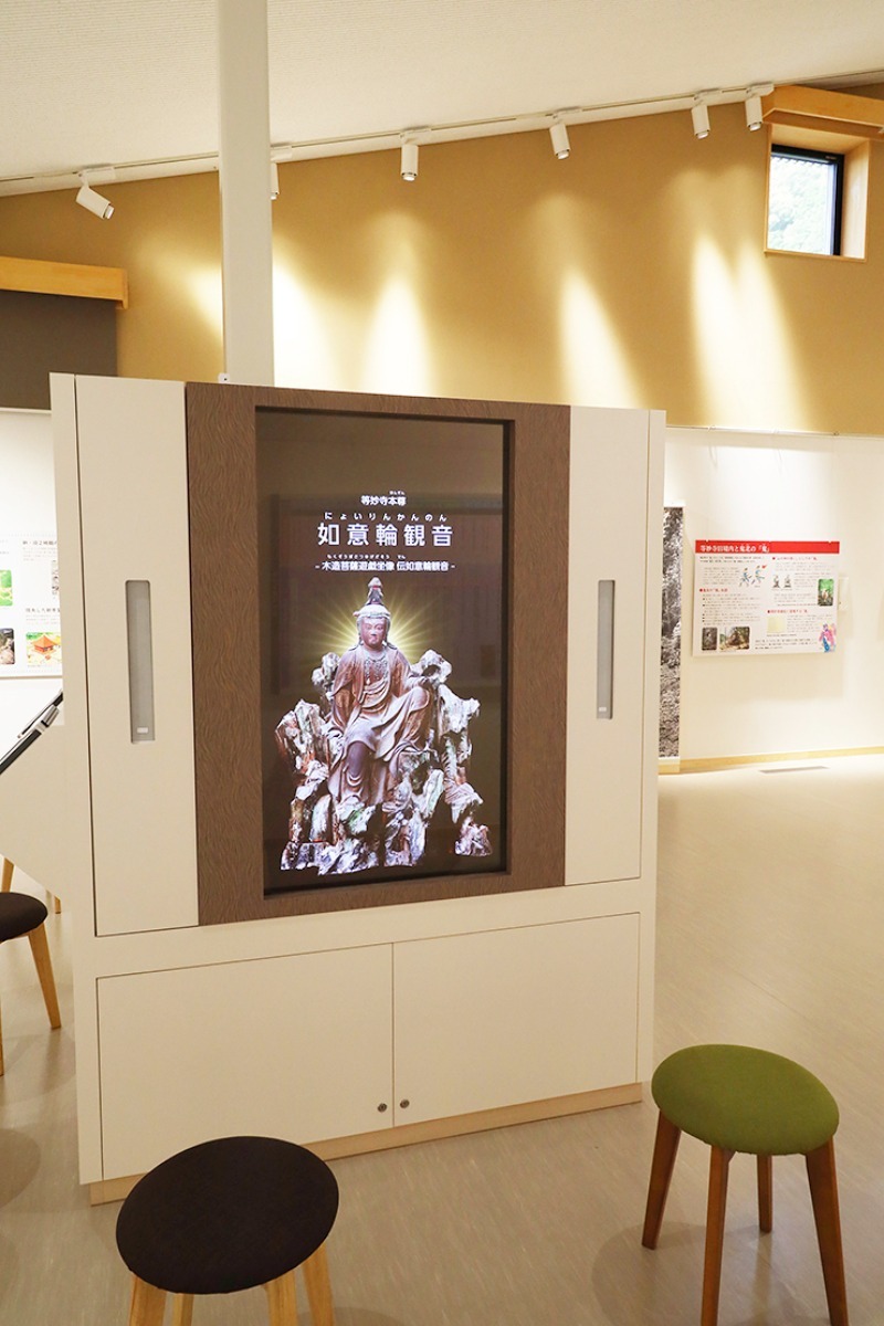 「等妙寺」のご本尊である「木造菩薩遊戯坐像 伝如意輪観音(もくぞうぼさつゆげざぞう でんにょいりんかんのん)」は、通常60年に1度しか公開されない秘仏ですが、ここでは、岩座に座る仏像を有機ELディスプレイで再現しています。