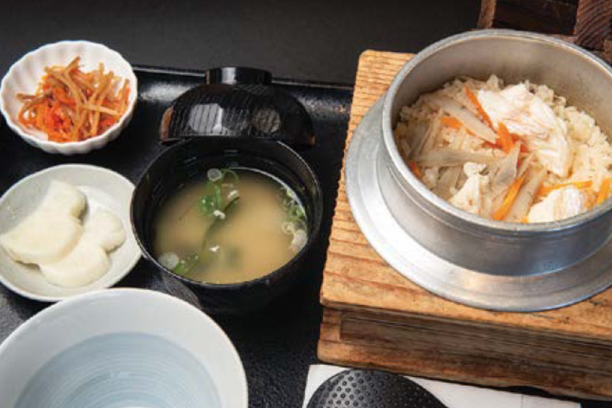 愛媛県産の鯛の身が贅沢に入った鯛釜めし。注文を受けてから高圧釜で炊き上げるスタイル。