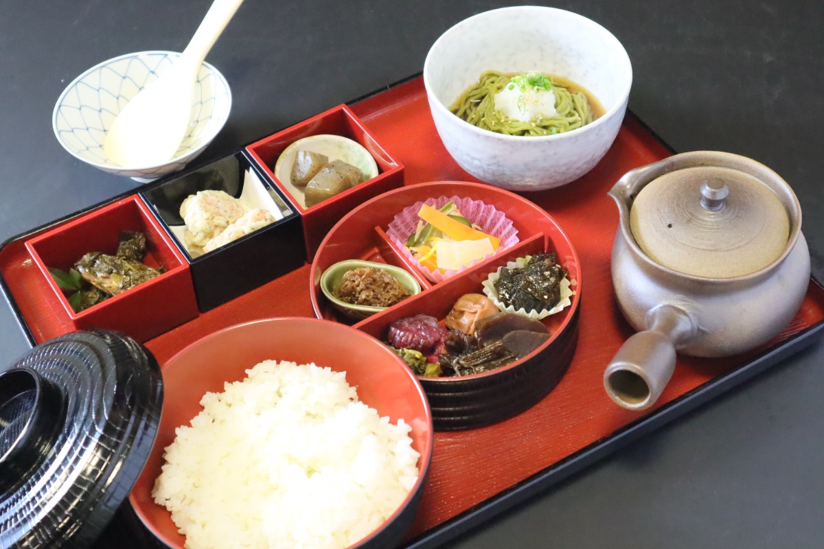 25周年を記念して登場した、茶そばやお茶の煮物などお茶尽くしのランチ。2024年12月30日までの期間限定!