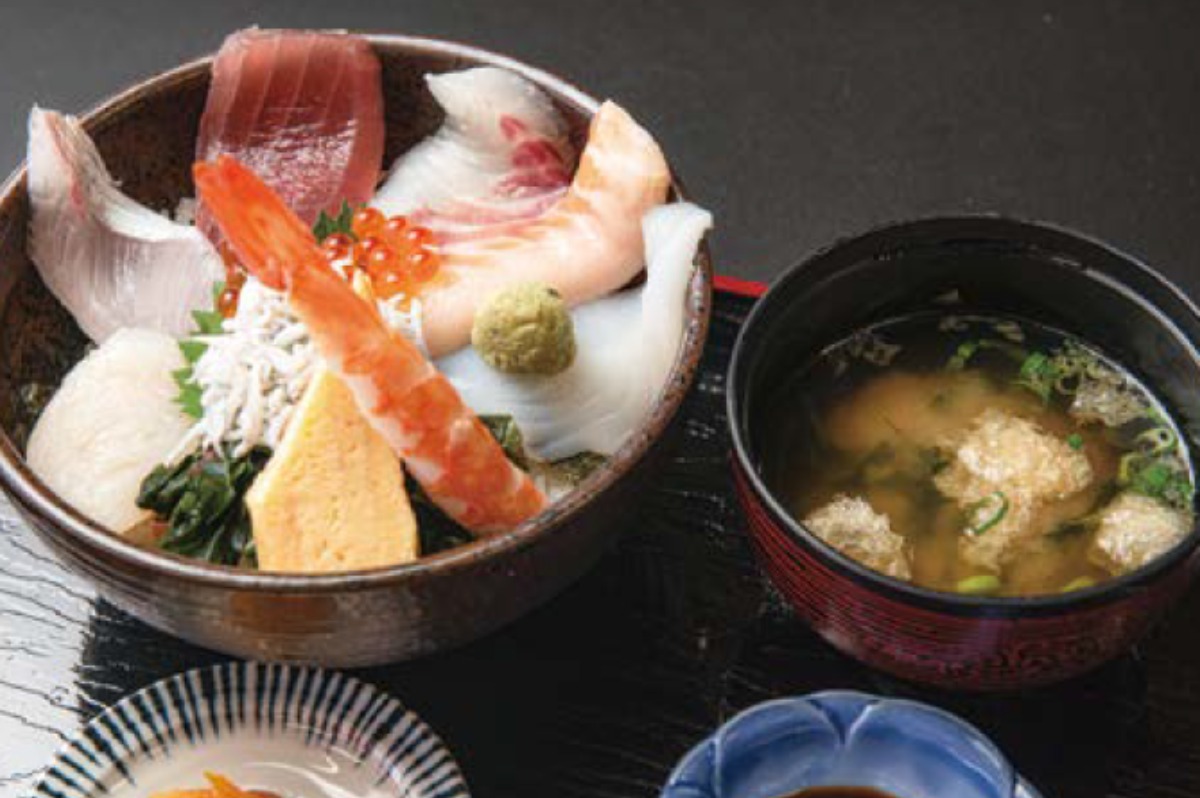 主に瀬戸内の魚介類を使用し、8種類以上の具材を盛り込んだ海鮮丼。赤酢の酢飯が自慢です!
