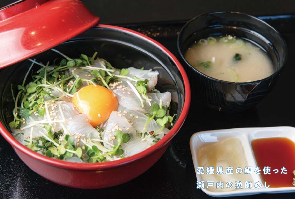 愛媛県産の鯛を使い、たっぷりの薬味と卵を絡めて食べる漁師めし。鯛か朝獲れアジから選べます。