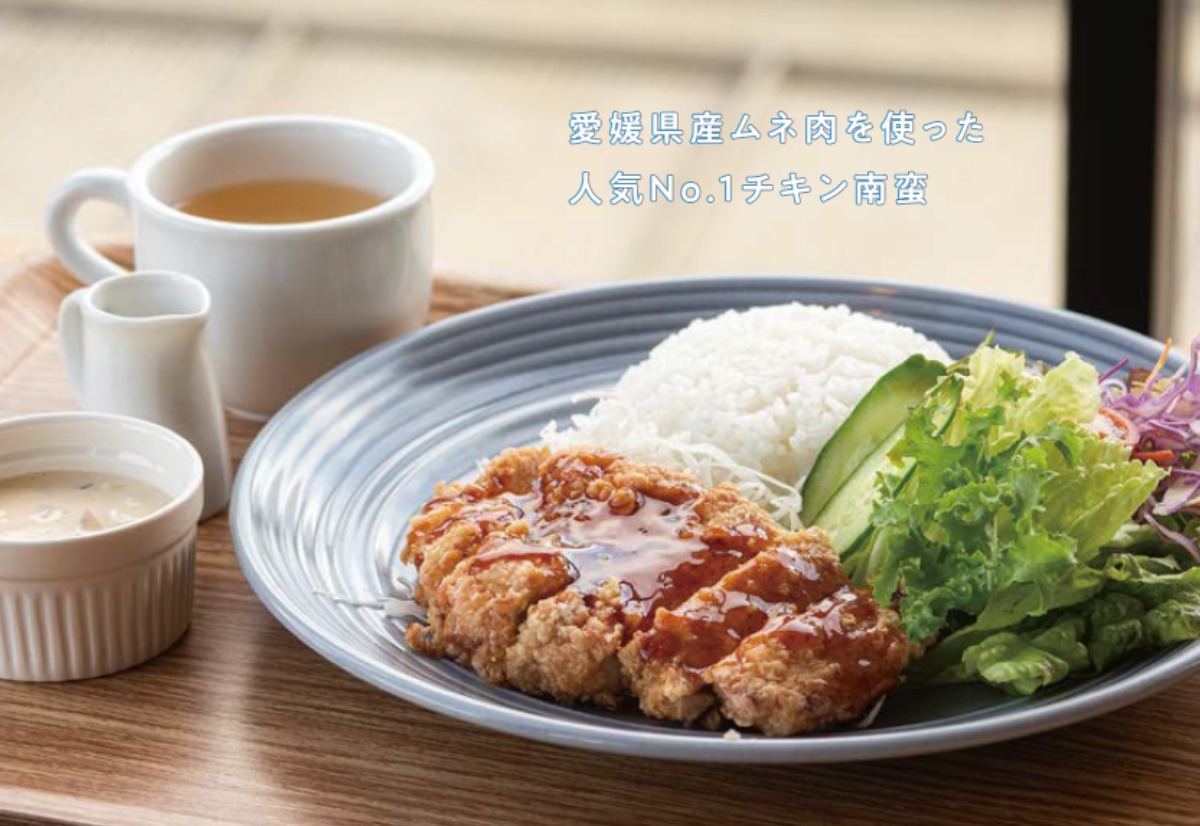 愛媛県産ムネ肉を使ったチキン南蛮。手作りタルタルがクセになる。今治産サラダ&スープ付き!
