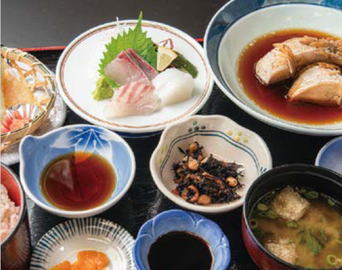 名物料理に加え、鮎の唐揚げや小鉢など豊富な品数で大満足のメニュー。