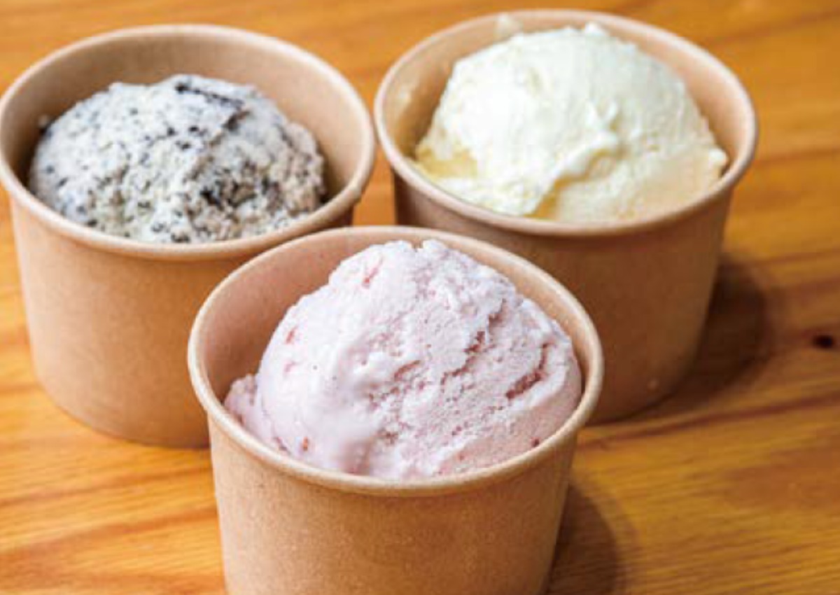 約10種のフレーバーから選べるジェラート。写真は朝摘みイチゴ、バニラ、クッキー&クリーム。