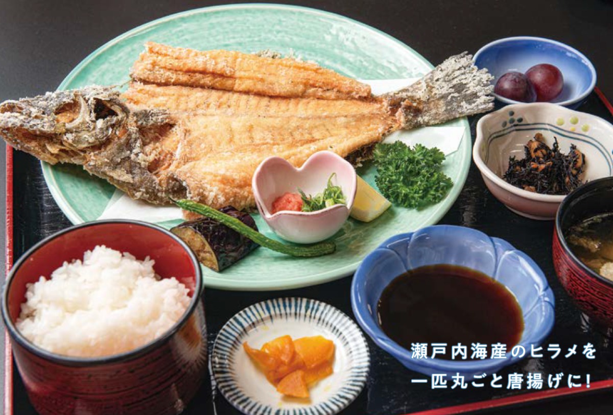 主に瀬戸内海で獲れたヒラメ一匹丸ごと唐揚げにした定食。ヒレや骨まで余すことなくどうぞ!