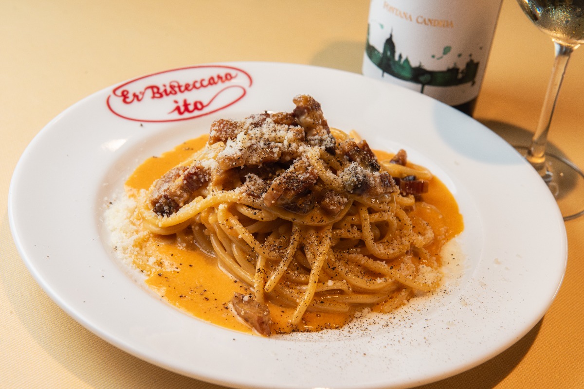 生クリームは使用せず、黄身が濃い卵黄とペコリーノチーズで作る本場濃厚カルボナーラ。