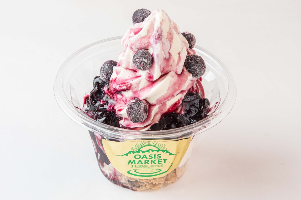 なめらかなソフトクリームに、新居浜市産のブルーベリーとブリーベリーソースがたっぷり!