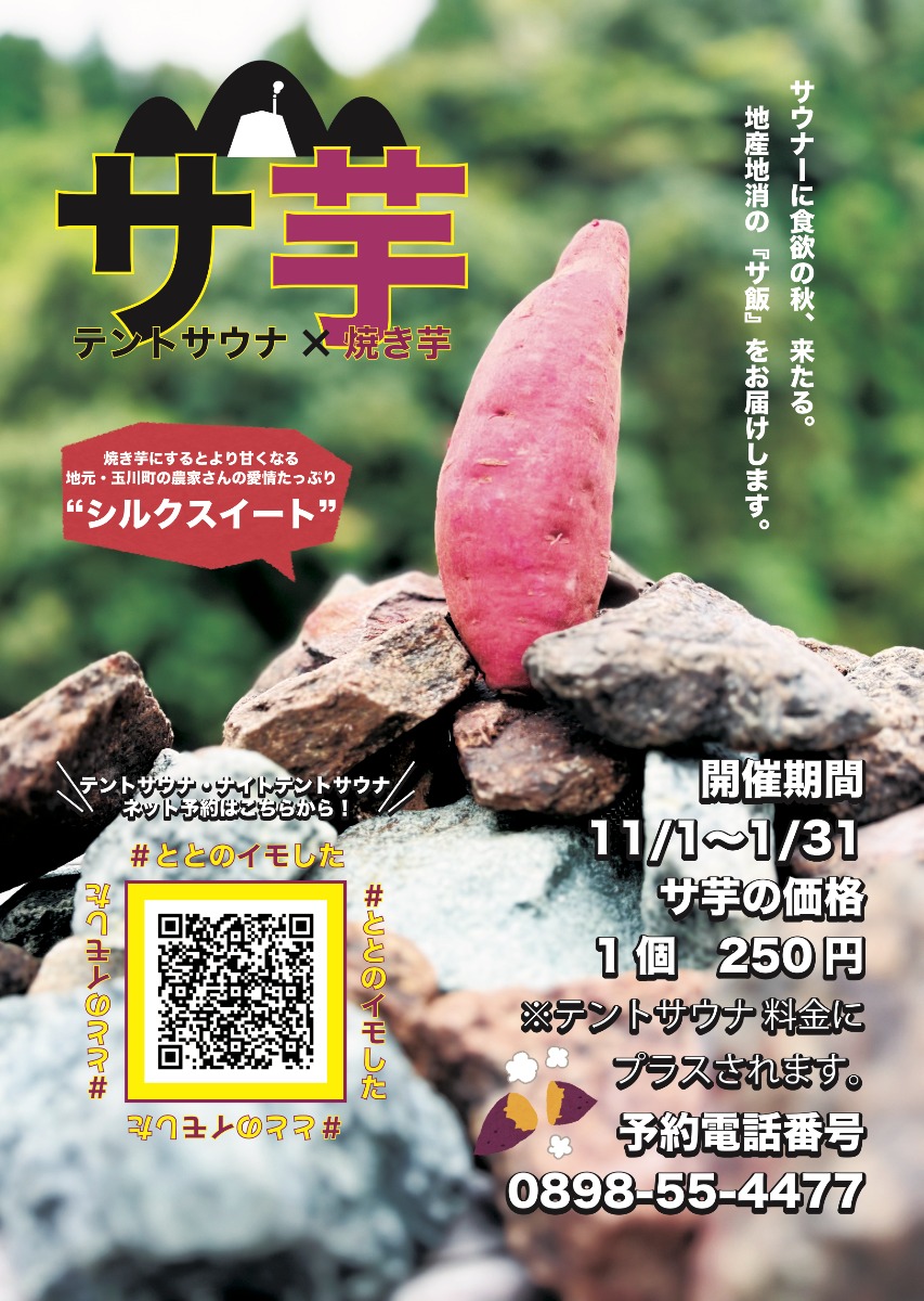 昨年人気だった、テントサウナ×焼き芋を掛け合わせた「サ飯」ならぬ\\サ芋(サイモ) //を期間限定で今年も開催!