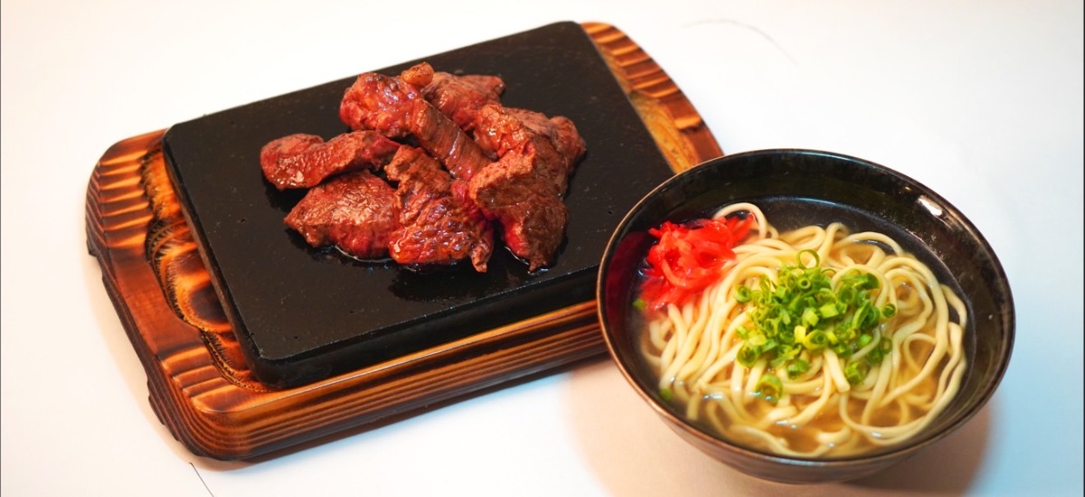 「やっぱりステーキ」のおすすめのサイドメニューは、沖縄から直送されたダシを使った「沖縄ミニそば」。290円というリーズナブルな価格で、四国にいながら本場の沖縄そばを楽しむことができます。