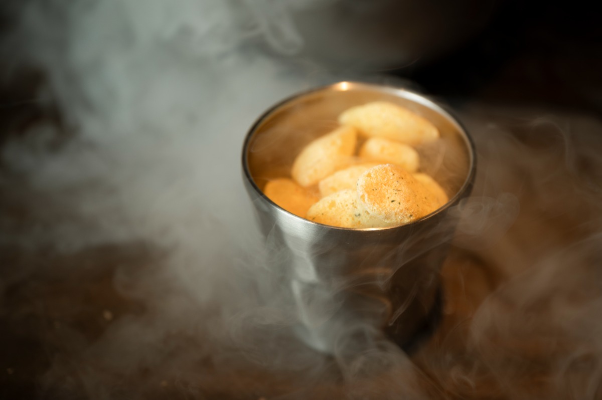 スナック菓子を液体窒素で凍らせた遊び心満載の1品。