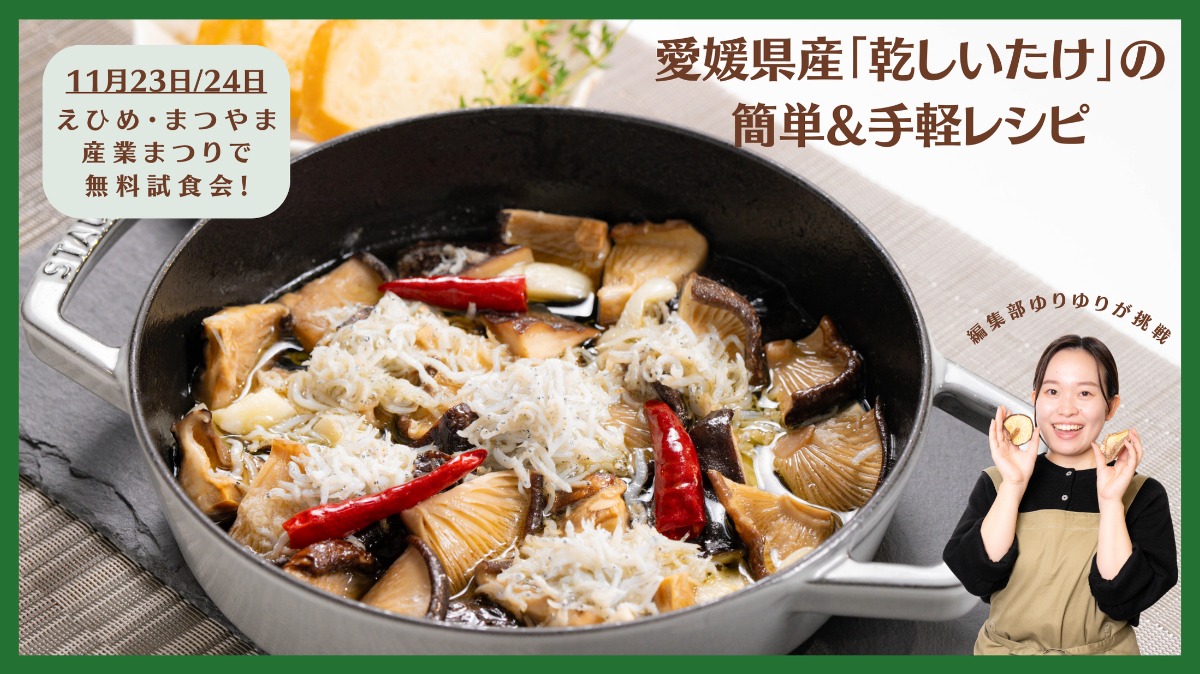 2024年11月23日(土)・24日(日)に松山市の城山公園で実施される「えひめ・まつやま産業まつりw i t hメディアパーティー すごいもの博2024」にて、「乾しいたけとしらすのアヒージョ」の無料試食会を実施!