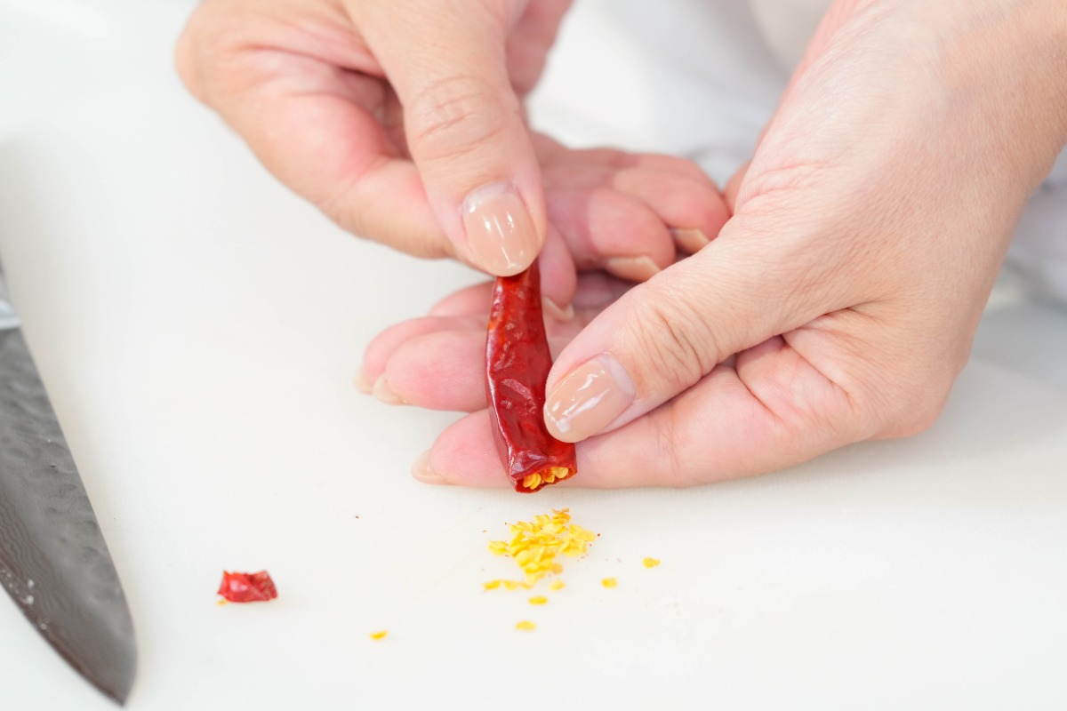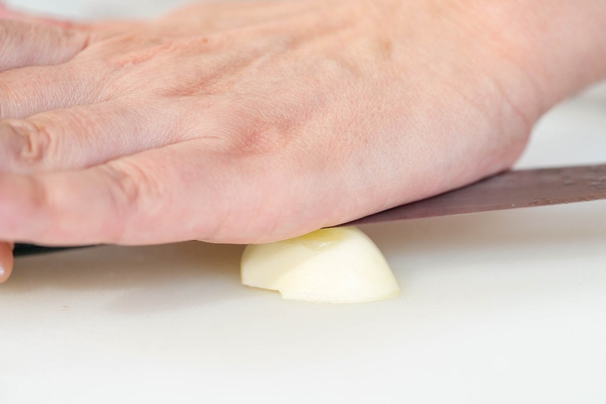 ②にんにくは半分に切ってつぶし、鷹の爪は種をとる