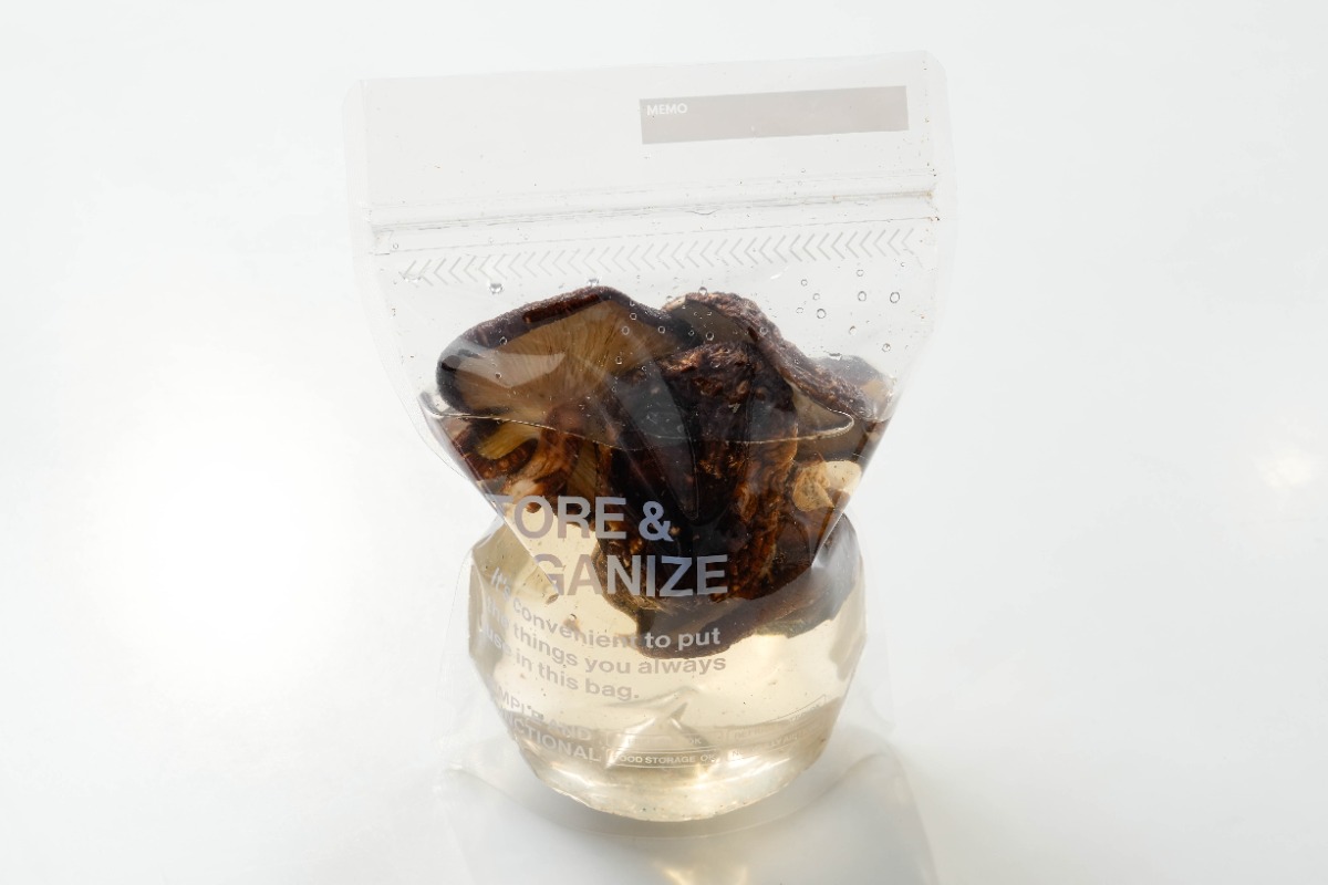 ②ポリ袋(ファスナー袋)に乾しいたけと冷水を入れる