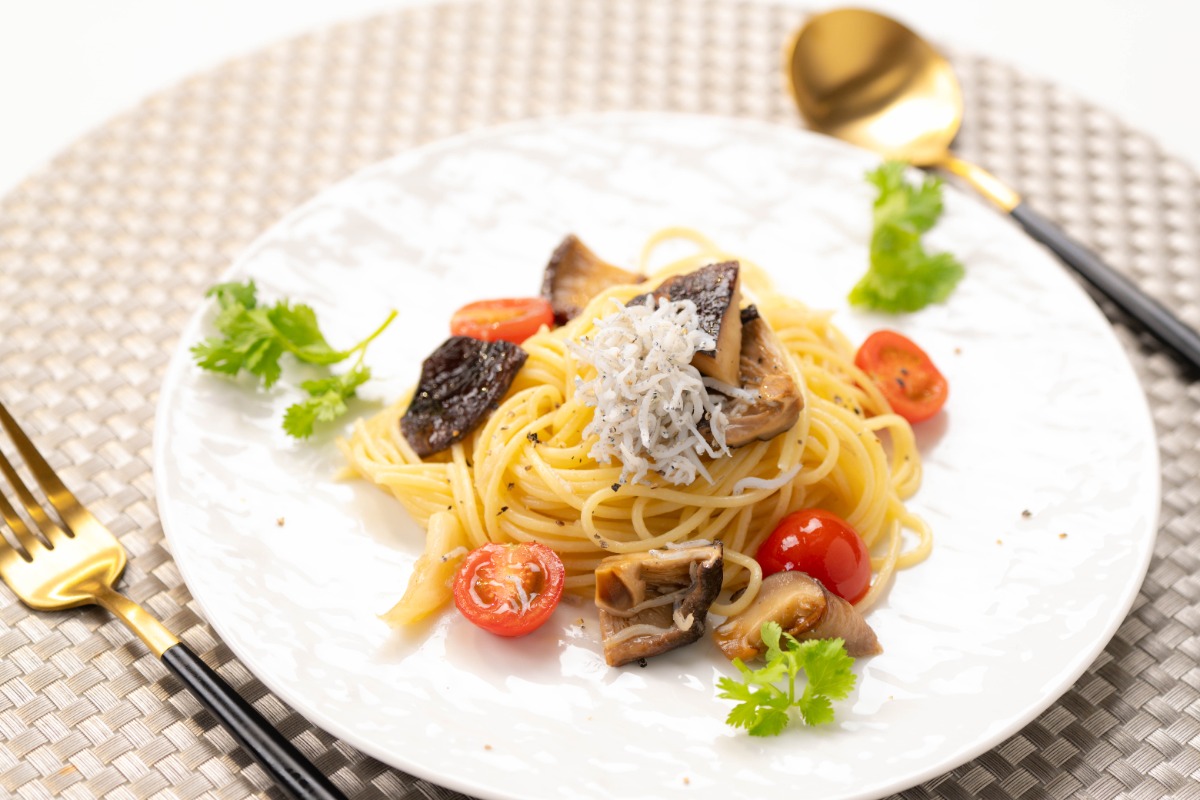 乾しいたけの戻し汁をパスタのゆで汁として使い、アヒージョのオイルを絡めると、風味豊かなオイルパスタの完成!トマトも入れて彩りよく食べてみてくださいね。