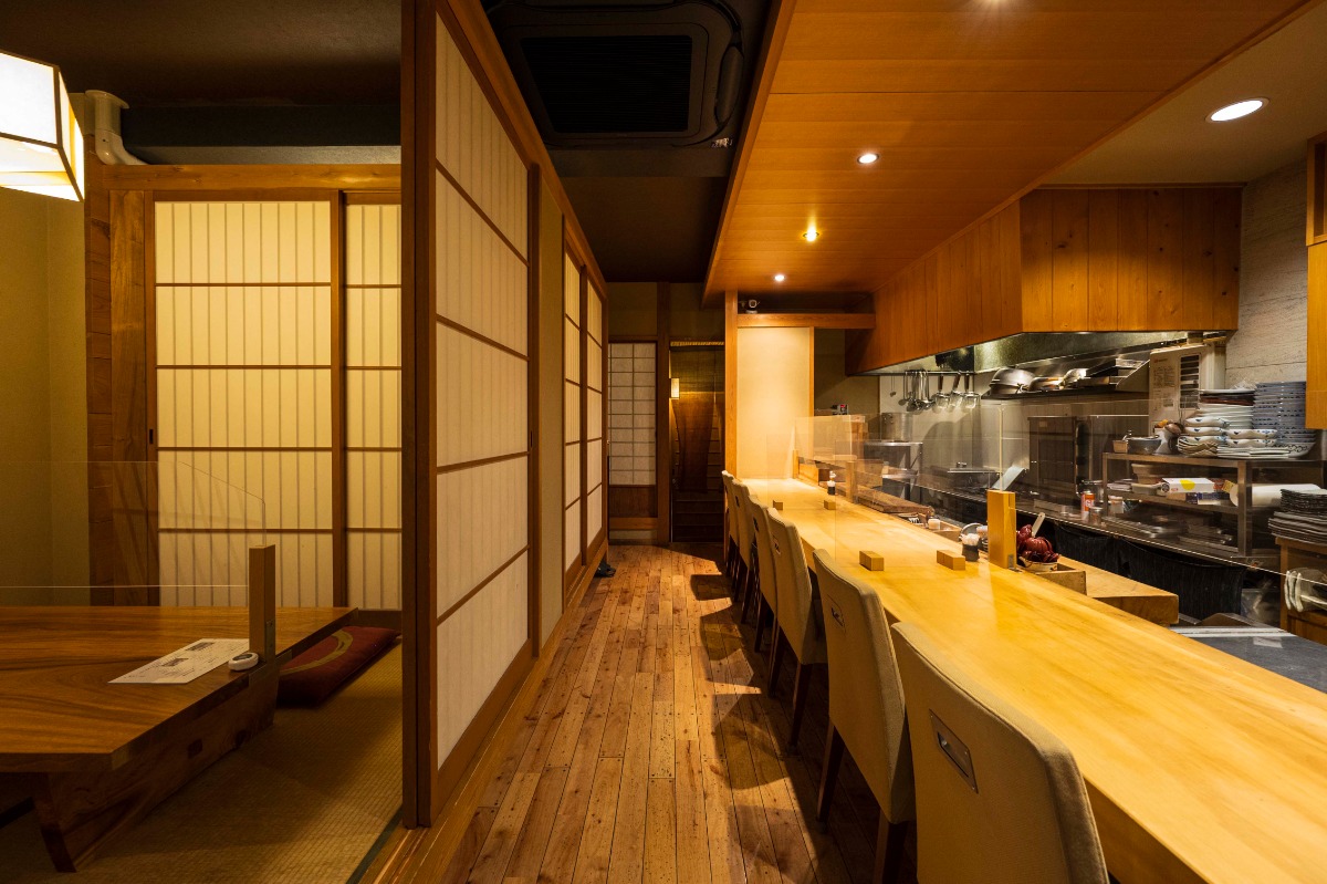 一枚板のカウンターが映える落ち着いた空間。