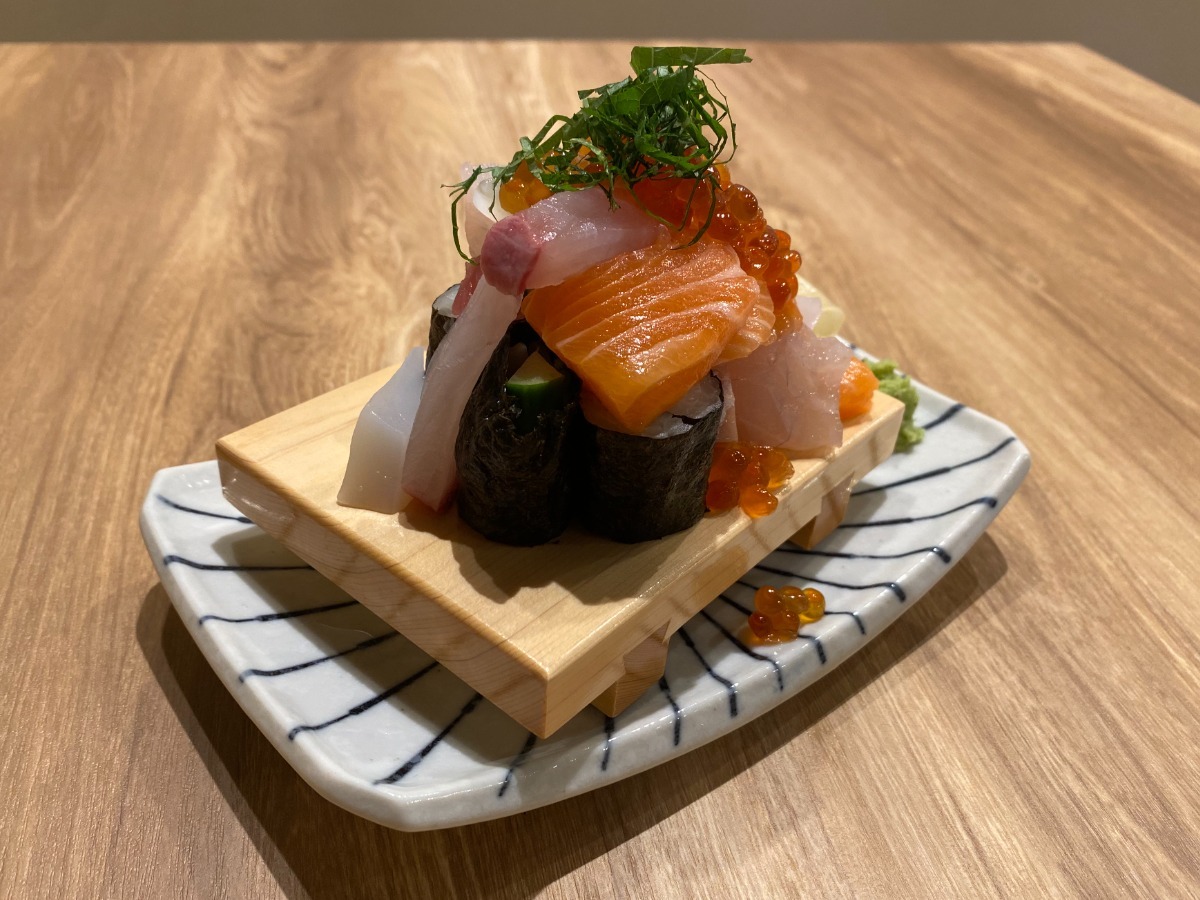 写真のマル八名物「こぼれ巻き寿司」は、見た瞬間に思わず「わあ!」と声が出るほどの豪華なビジュアル。