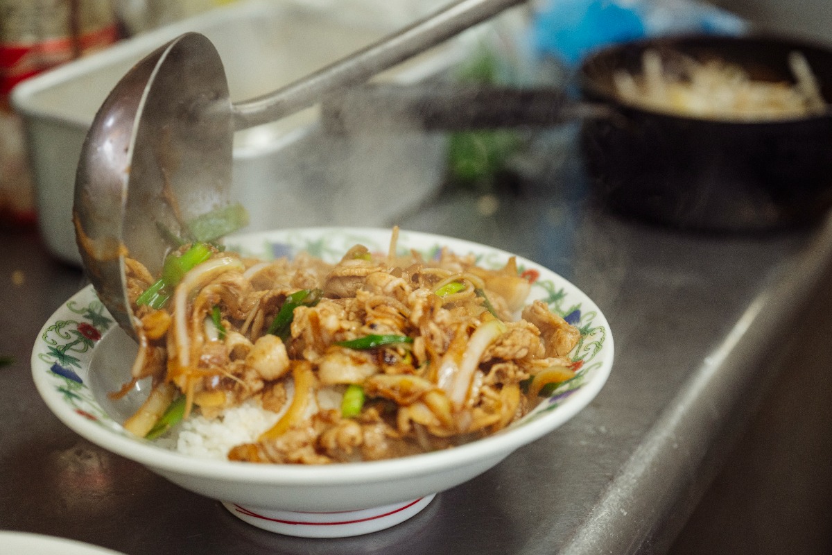 強火で一気に炒めた生姜焼きを多めに盛ったご飯の上に。