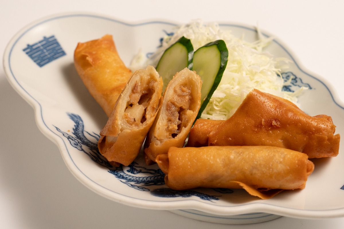 噛んだとき、皮がパリッと割れるくらいの硬さに仕上げています。唐揚げなど他のものを揚げる際の温度より少し低めの温度の油で揚げることで、ちょうどよい食感になるのだそう。1人前で4本。とろっとした餡と皮の食感の違いも美味しさのポイントです。