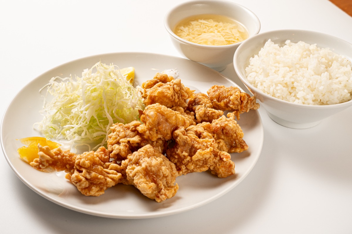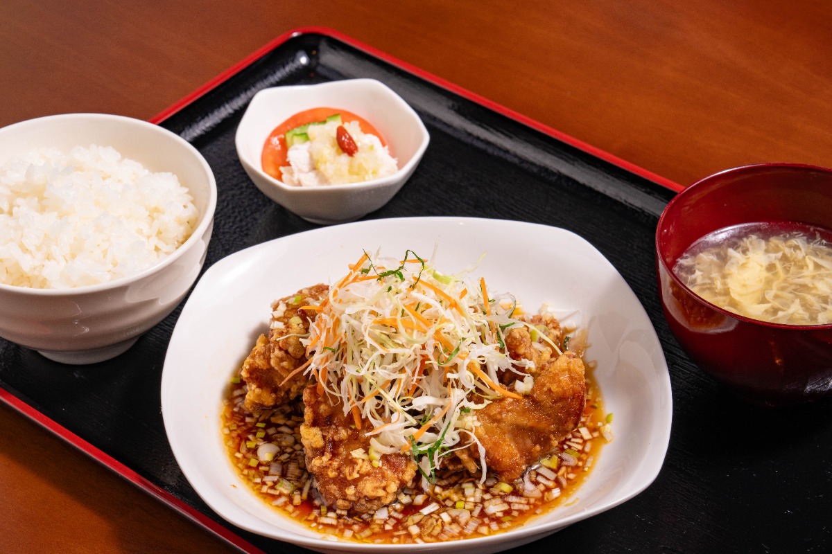 セット内容:油淋鶏、小鉢、スープ、ご飯