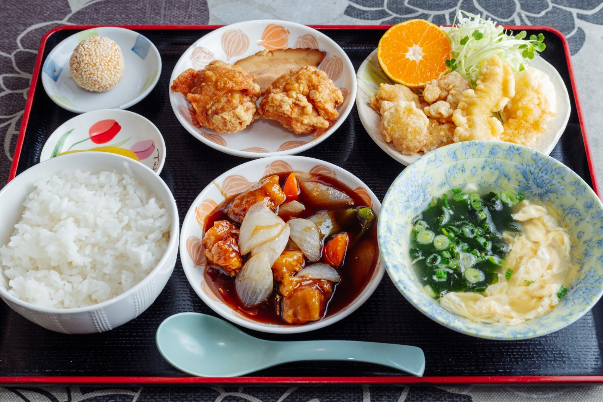 昭和60年の創業以来、夫婦二人三脚で営むお店。務めいろいろなものを少しずつ味わえるボリューム満点の定食。揚物3種と人気の酢豚、焼豚がセットになっています!