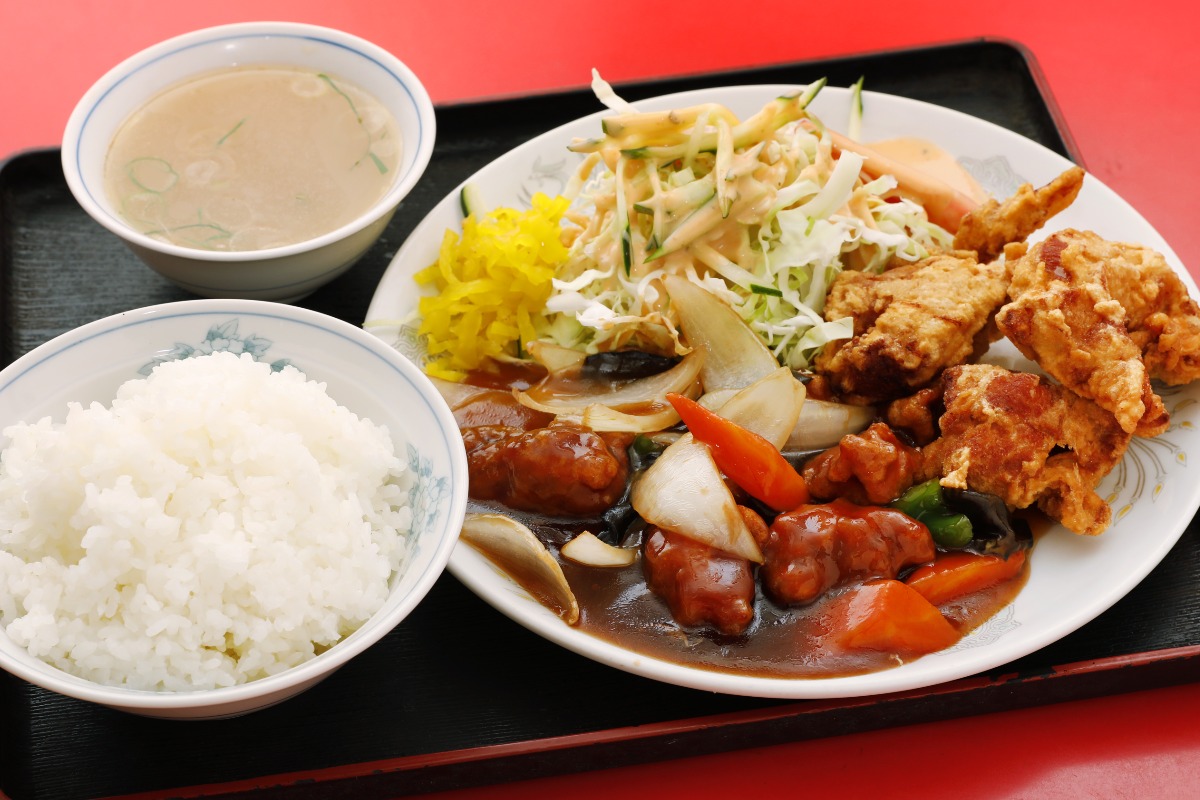 セット内容:酢豚、唐揚げ、サラダ、ライス、スープ