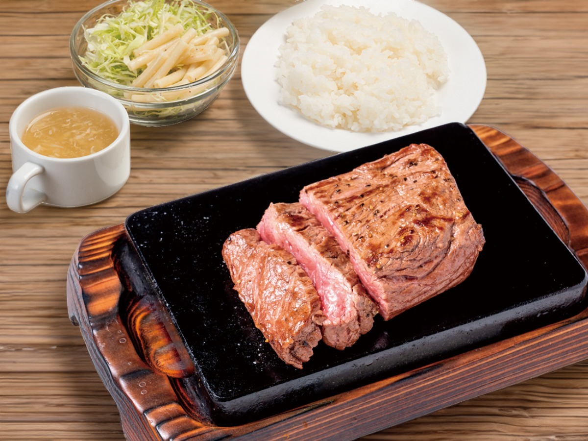 写真の「やっぱりステーキRサイズ」は、牛1頭から数kgしか取れない希少部位「ミスジ」を店舗で一つひとつ丁寧に筋取りした、柔らかくジューシーな仕上がりです。