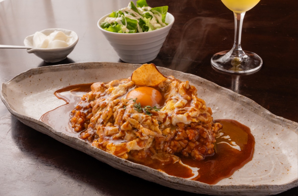 たっぷりのデミグラスソースがかかったふわふわのオムライスの上に、卵黄がトッピング。トマトの旨みが詰まったライス、味わい深いソースが見事に調和し、ひと口食べると何とも言えない幸福感に包まれます。
