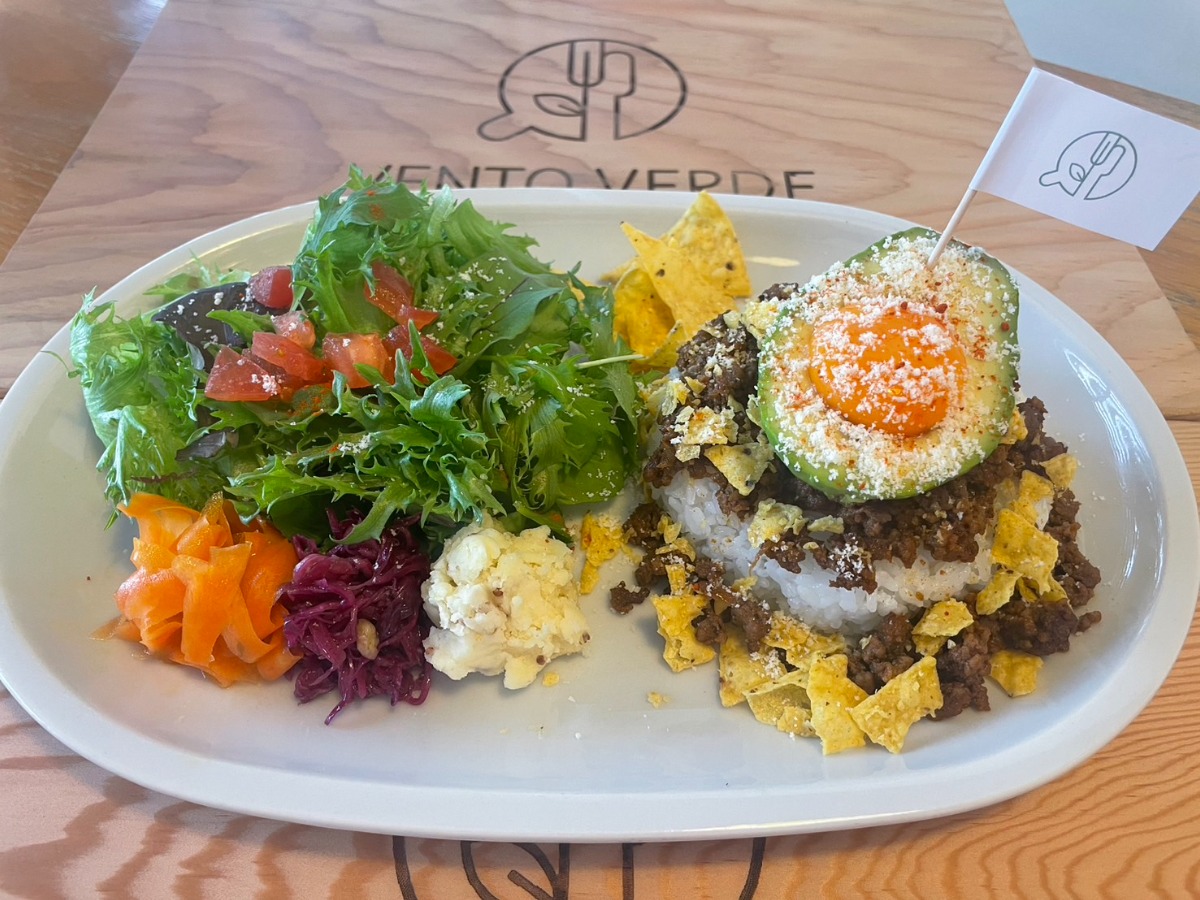 ランチタイムには4種類の多国籍メニューが揃い、イチオシは「アボカドタコライス」(1,500円)。スパイシーなタコライスの上に半分にカットされたアボカドと卵黄がトッピングされ、満足感たっぷりの一皿です。食前にはビネガードリンクが提供され、健康を意識したサービスも魅力的。また、副菜にはアンチョビポテトや彩り豊かなサラダがついてきます。エスニックな風味と新鮮な地元野菜のハーモニーをぜひ味わってみてくださいね。