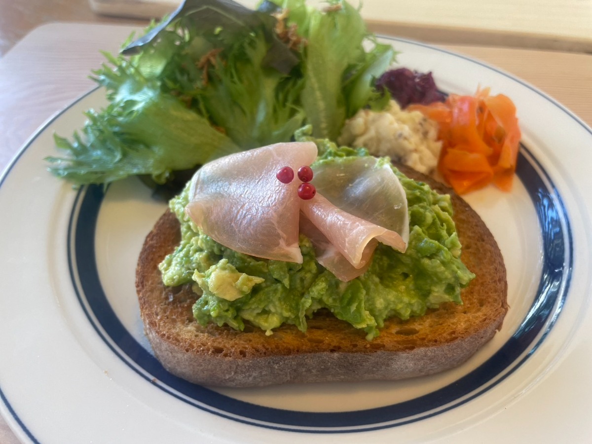 「VENTO VERDE CAFE」には8種類のモーニングメニューがあり、中でも店長おすすめは、「アボカド&生ハムのオープンサンド」(ドリンク代+600円)。クリーミーなアボカドがカンパーニュの上にたっぷりとのり、塩気の効いた生ハムがアクセントに。見た目も味も贅沢な一皿です。さらに、キャロット、フレンチ、ごまの3種類のドレッシングが選べるサラダがセットで付いてくるのも嬉しいポイント。