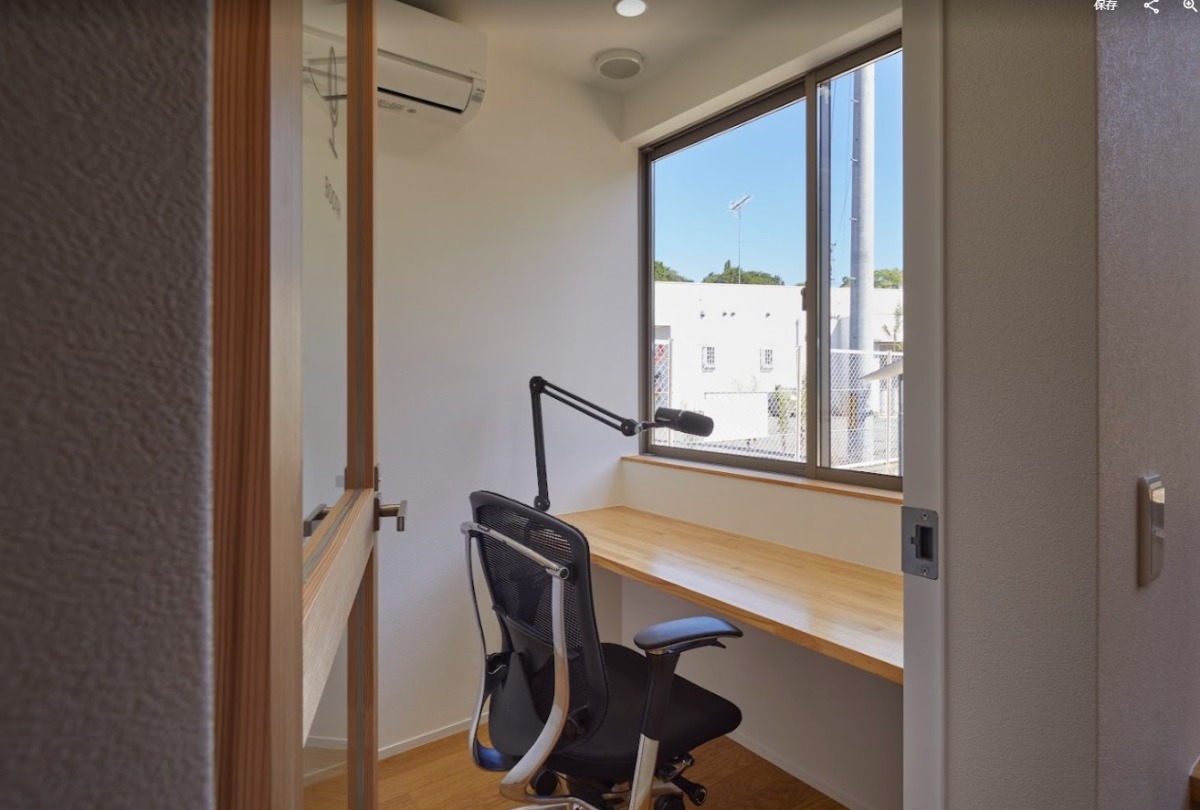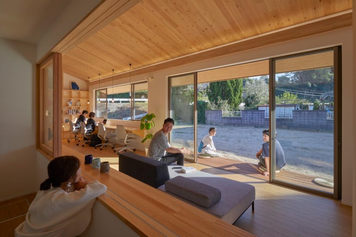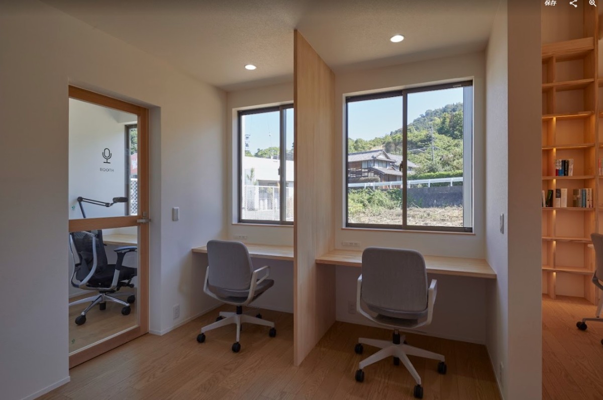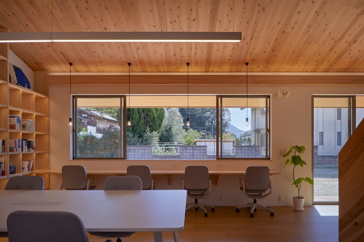 1166㎡の敷地に広がる「LLACハウス」は、しまなみ海道の風景に溶け込むデザインが魅力です。建物内部は高低差を持たせた天井設計と、心地よさを追求した一体的な空間が広がります。南向きの縁側で海風を感じながらリラックスするも良し、半個室や個室で集中して作業するも良し、使い方は自由自在です。