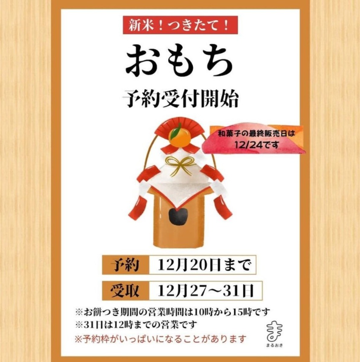 師走に入り、今年もあと少しです。新しい年に向けてそろそろ準備を始めている人もいるのではないでしょうか。「まるおき雄郡店」では、新米を使った、お正月用のつきたてのおもちの予約受付も開始されています。予約は12月20日まで、受け取りは12月27日~31日です。予約枠がいっぱいになると注文が終了となるそうなので、早めの準備がおすすめです。