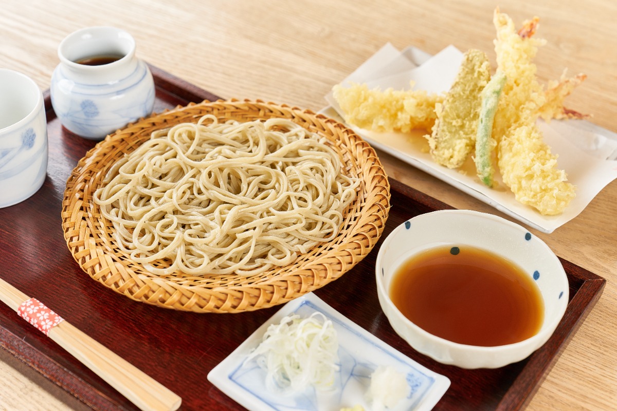 メニューはシンプルで、定番の「天ざる蕎麦」や、汲み上げ湯葉や季節の素材を使った前菜メニューが一緒に楽しめる「お昼のおきまり」が人気です!