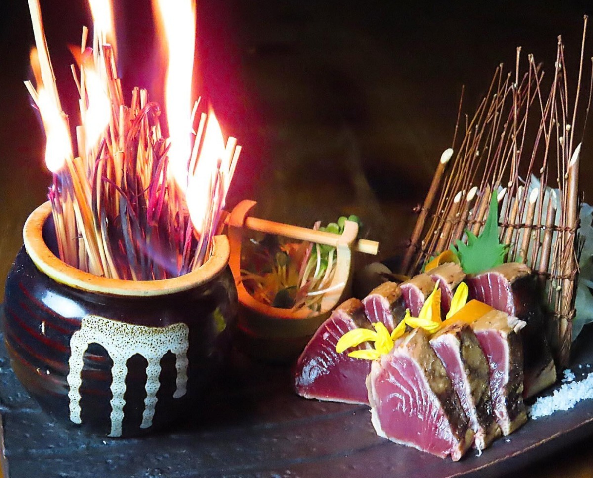 写真は、無農薬の藁を使った鮮魚の藁焼き。県内産の鯛やカツオなどを豪快に焼き上げ、藁の香りも堪能できる逸品です。