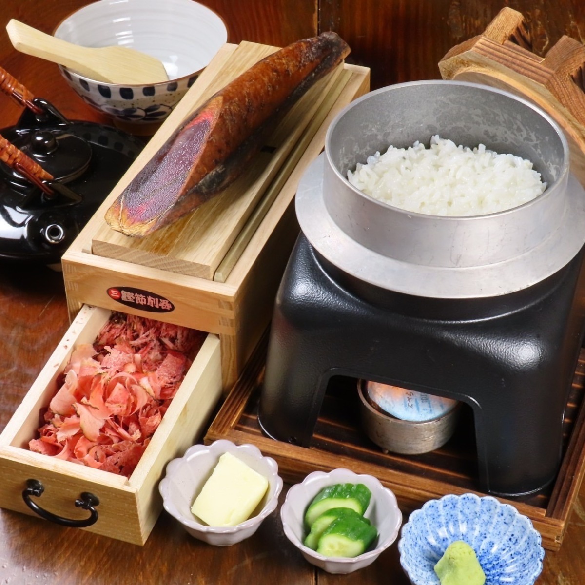 ユニークな一品「削りたて鰹節と釜炊き銀シャリで食べる名物おかか飯」(880円)は、賞味期限たったの1分!?食材本来の魅力を最大限に引き出したこのメニューは、幅広い世代に人気です。シンプルながらも贅沢な味わいを楽しめます。